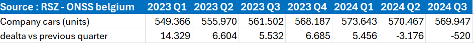 Tussen het eerste en het tweede kwartaal van 2024 zien we dus een daling met 3.176 voertuigen volgens de cijfers van de RSZ. Deze daling wordt – zij het in mindere mate – bevestigd in het derde kwartaal met -520 voertuigen.