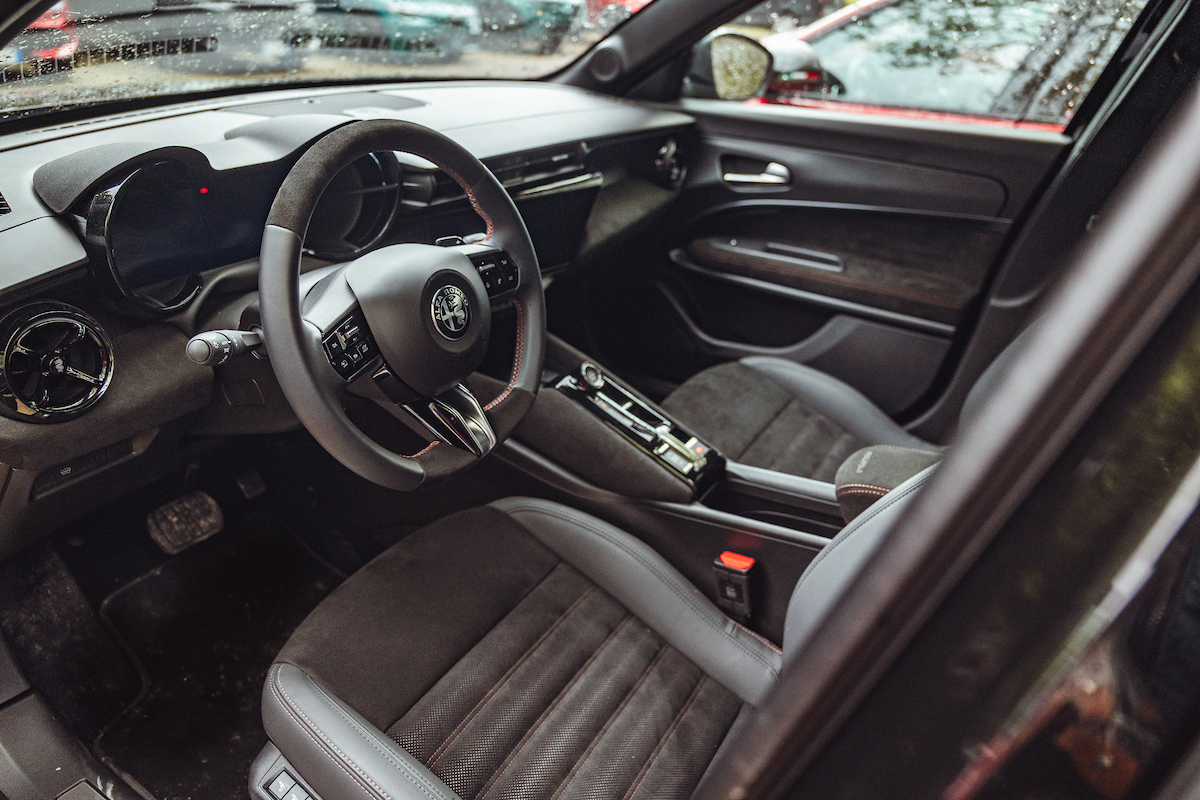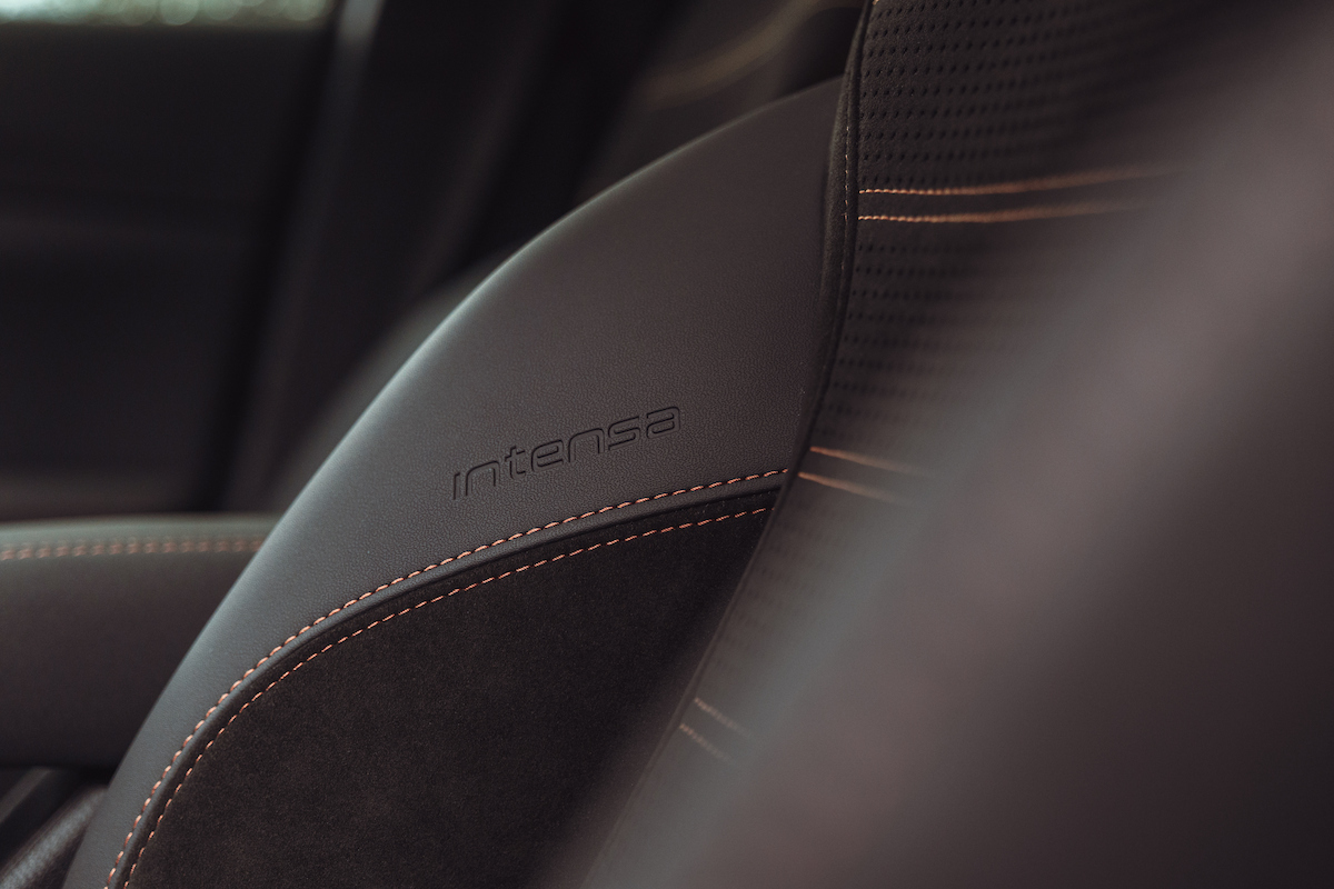 In het interieur worden edele materialen zoals alcantara en leder geaccentueerd door contrasterende stiksels en geborduurde Intensa-logo’s. Ook het tweekleurige stuurwiel, de deurpanelen en de armsteunen zijn voorzien van die esthetische signatuur.