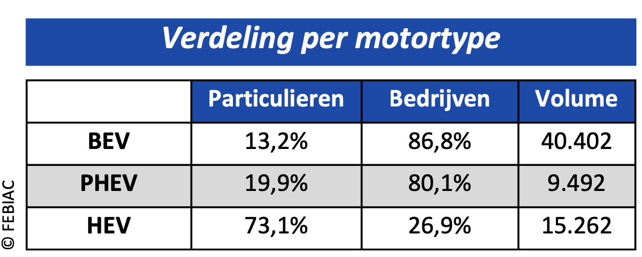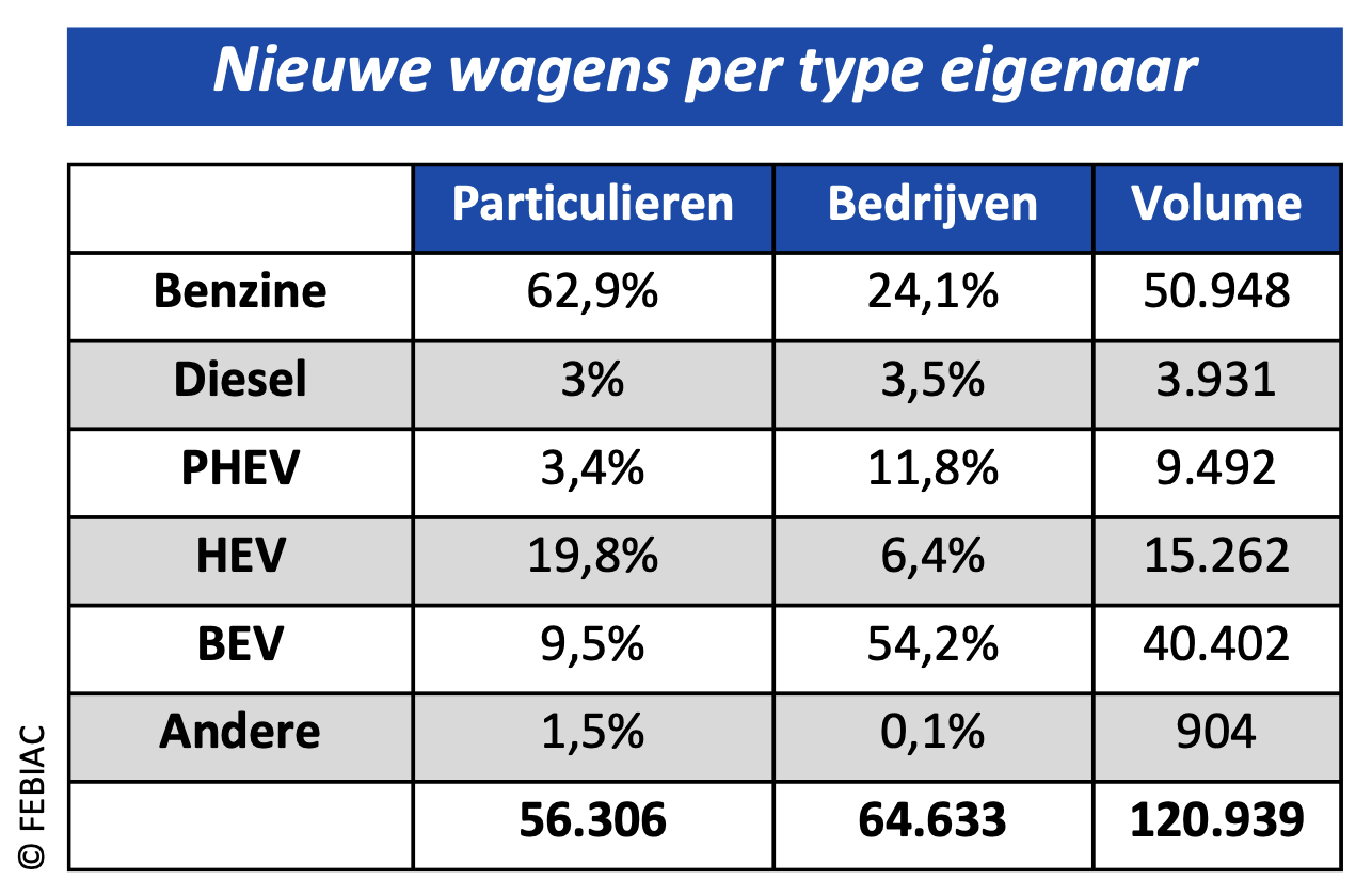 Doordat de markt voor particulieren zo fel is aangetrokken en benzine nog steeds populair is bij de particuliere kopers, blijft benzine de ranglijst van de populairste aandrijvingen aanvoeren. Deze aandrijving haalt een marktaandeel van 42,1% (een zeer lichte stijging ten opzichte van het volledige jaar 2024), vóór elektrische voertuigen, die met bijna 5% stijgen, en HEV (hybride wagens zonder stekker), die met 3,4% stijgen en dit jaar de derde plaats inneemt als populairste motorisatie in België.
