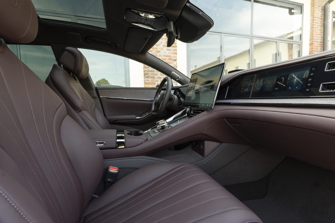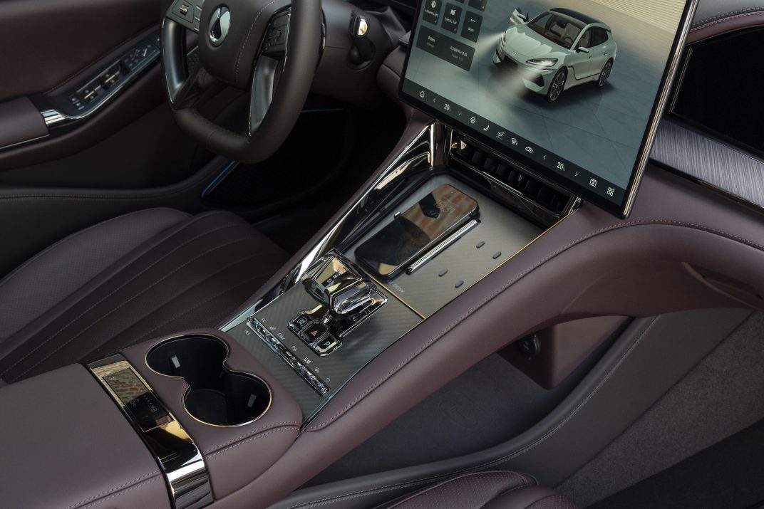 Het interieur vertoont een uitstekende kwaliteitsindruk en er werd heel wat aandacht besteed aan de materialen. Leder, mat hout en kristallen elementen (die naar verluidt in de Europese versie zullen verdwijnen voor een meer verfijnde look) worden met elkaar gecombineerd in een minimalistische lay-out die wordt gedomineerd door een centraal scherm van 17,3 duim en twee secundaire exemplaren van 13,2 duim.