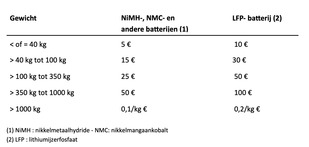 De milieubijdrage voor recyclage van ba3erijen en modules voor de aandrijving van hybride, plug-in hybride of elektrische voertuigen varieert in func2e van de chemische samenstelling en het gewicht van de baeerij en bedraagt (prijzen incl. BTW):
