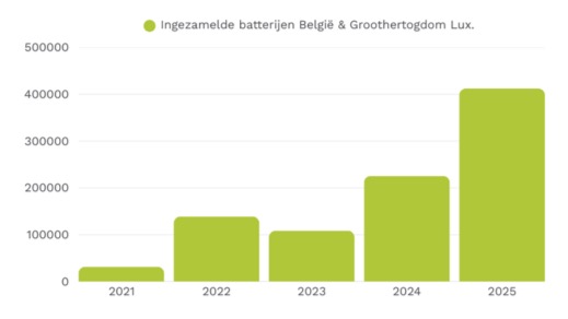 Het aantal ingezamelde afgedankte EV-batterijen blijft voorlopig nog beperkt, omdat de meeste elektrische voertuigen nog niet aan het einde van hun levenscyclus zijn en omdat EVbatterijen nu eenmaal een lange levensduur hebben. Toch stijgen de volumes snel: van 31.585 kg in 2021 naar 412.400 kg in december 2025. Dat is een toename van net geen 1200% in amper 4 jaar tijd.