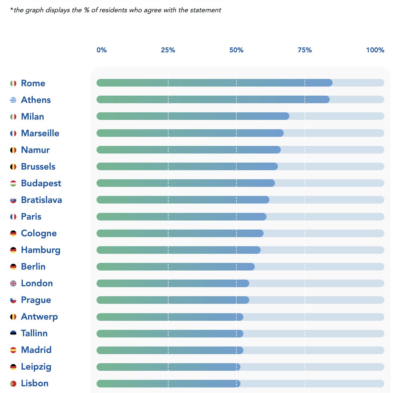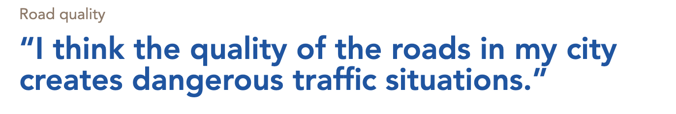 Meer dan de helft van de Europeanen (51%) vindt dat de kwaliteit van de wegen in hun stad gevaarlijke situaties veroorzaakt. Vooral in steden als Rome (82%), Athene (81%) en Milaan (67%) wijzen inwoners op het slechte wegdek als oorzaak van onveilige verkeerssituaties. Ook in België is de wegenkwaliteit een heikel punt, vooral in Brussel en Namen, waar respectievelijk 63% en 64% van de inwoners de wegen als onveilig beschouwen.