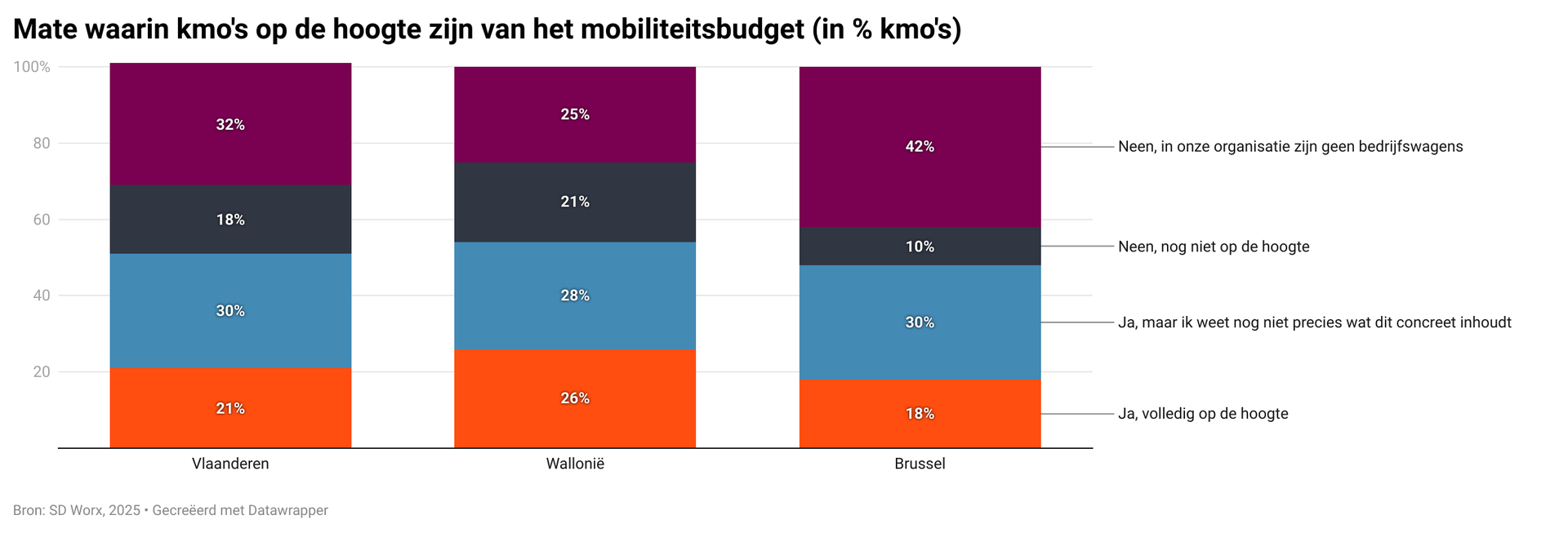 Vanaf 1 januari 2026 zou elke werkgever ook het mobiliteitsbudget verplicht moeten aan bieden aan elke werknemer met (recht op) een bedrijfswagen. Slechts een minderheid, nl. een op de vijf kmo’s, is hiervan helemaal op de hoogte. Er zijn beperkte regionale verschillen tussen kmo’s in Vlaanderen (21%) en in Brussel (18%).