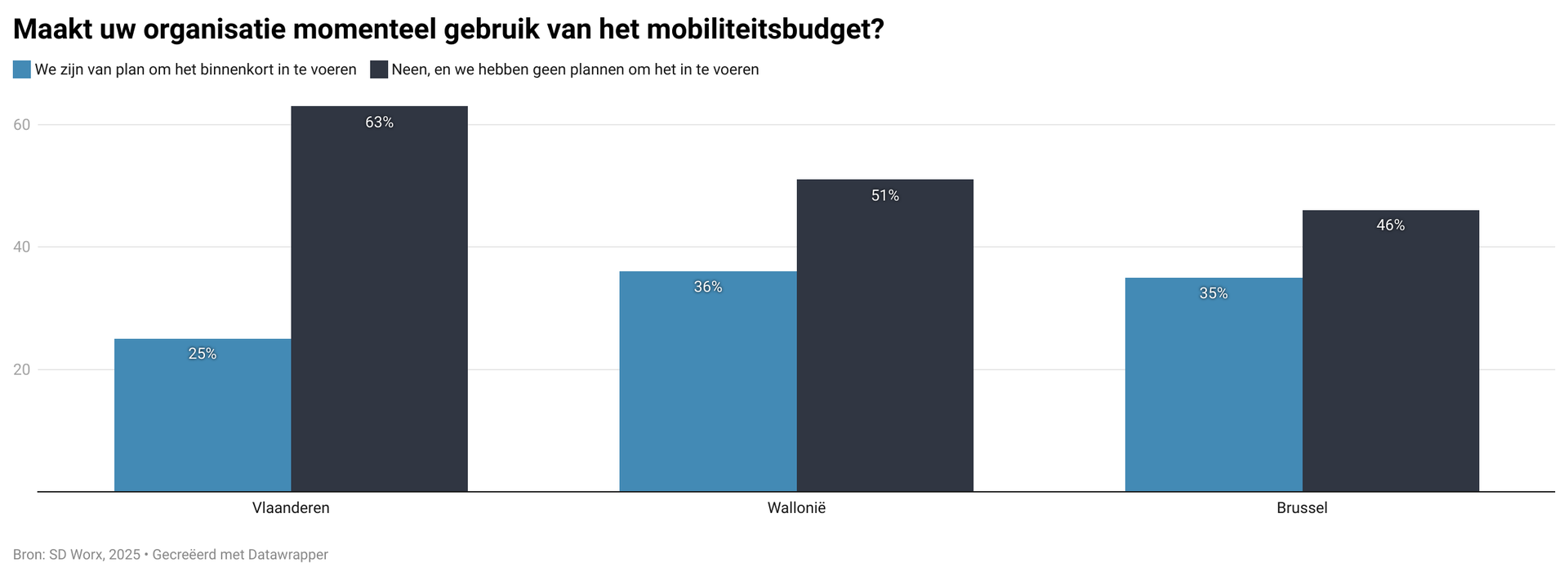 Slechts een op vijf kmo’s is helemaal op de hoogte van de nieuwe verplichting om vanaf 1 januari 2026 een mobiliteitsbudget aan te bieden aan elke werknemer met (recht op) een bedrijfswagen. Bijna de helft (48%) is onvoldoende op de hoogte. Een kwart van de Vlaamse kmo’s met bedrijfswagens wil binnenkort werk maken van het mobiliteitsbudget. In Brussel is dat zelfs 35%. Zes op de tien hebben geen plannen, vooral omdat ze onvoldoende kennis hebben over de mogelijkheden (42%), geen interesse vaststellen bij medewerkers (37%) of een administratieve complexe last vrezen (30%). Het merendeel van de bedrijfswagens zijn functiewagens, nodig voor klantenbezoek, wat het inruilen ook kan bemoeilijken. Dat blijkt uit een recente bevraging van SD Worx bij 503 kmo’s in juni 2025.