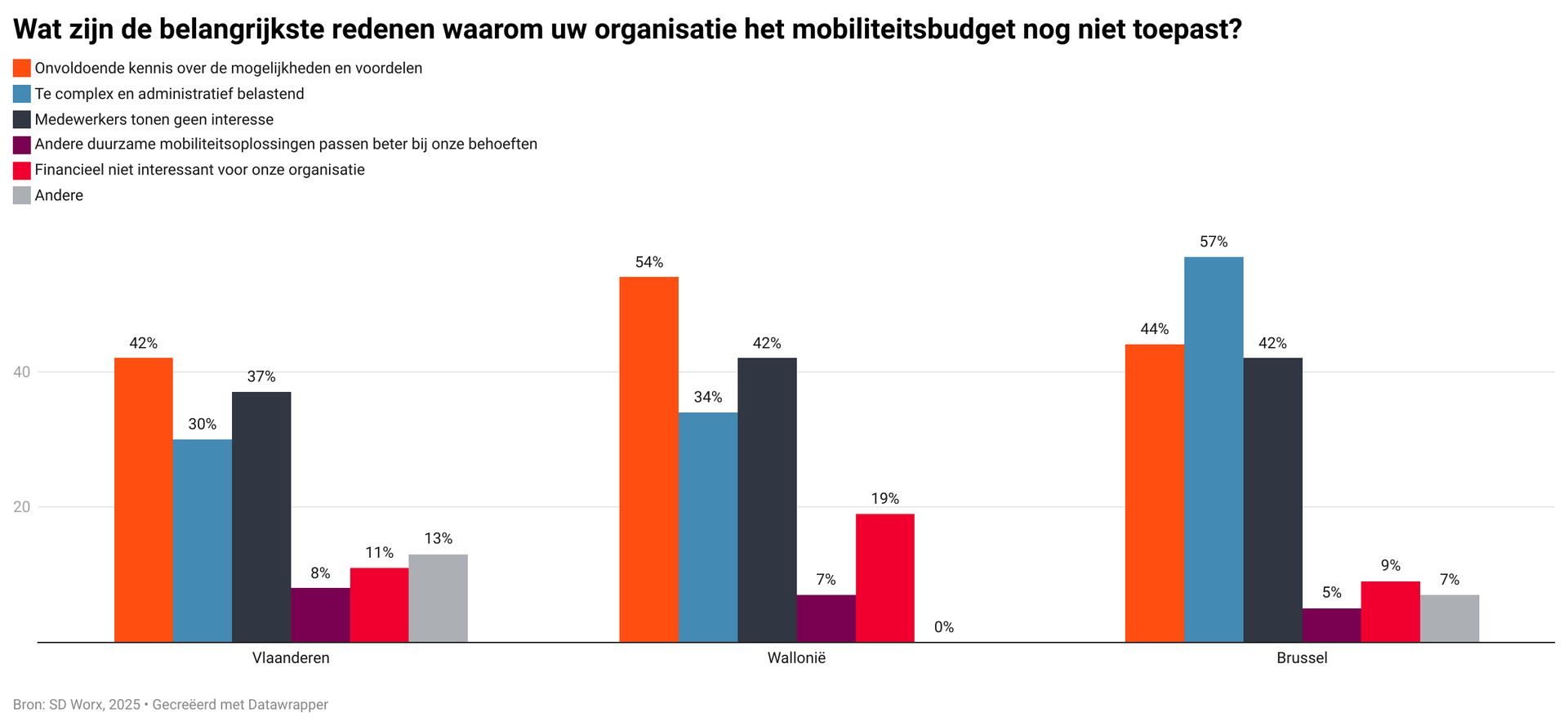 | Ongeveer zes op tien Vlaamse kmo’s met bedrijfswagens (63%) willen er geen werk van maken. In Brussel en Wallonië ligt dit cijfer lager met resp. 51% (Wallonië) en 46% (Brussel); zo goed als de helft. SD Worx polst in het onderzoek ook naar de redenen om het mobiliteitsbudget nog niet in te voeren. In volgorde van belangrijkheid voor Vlaanderen: |