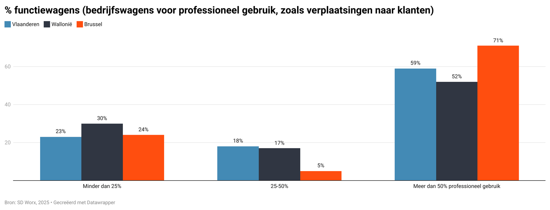 Zes op tien van de bedrijfswagens bij Vlaamse kmo’s zijn functiewagens; het merendeel wordt voor meer dan 50% (zelfs voor meer dan 75%) gebruikt voor klantenbezoeken. In Vlaanderen en Brussel zou minder dan een kwart van de wagens minder (dan 25%) voor professionele doeleinden als klantenbezoek dienen.