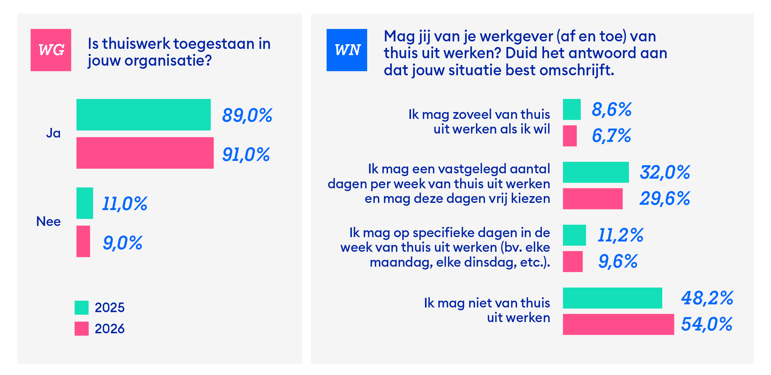 De meerderheid van de werknemers (64,9%) is tevreden met het huidige thuiswerkbeleid in hun organisatie. Amper 5,1% zou nog vaker naar kantoor willen komen, terwijl 30% net nog meer thuis zou willen werken. Op hun beurt vinden ook de werkgevers (63,4%) de balans van het hybride werken in evenwicht en willen ze die dus niet veranderen. Al lag het percentage vorig jaar toch wat hoger (69,6%). Ruim een kwart (27,3%) van de bedrijven zou graag hebben dat hun werknemers structureel meer naar de werkvloer komen dan nu het geval is.