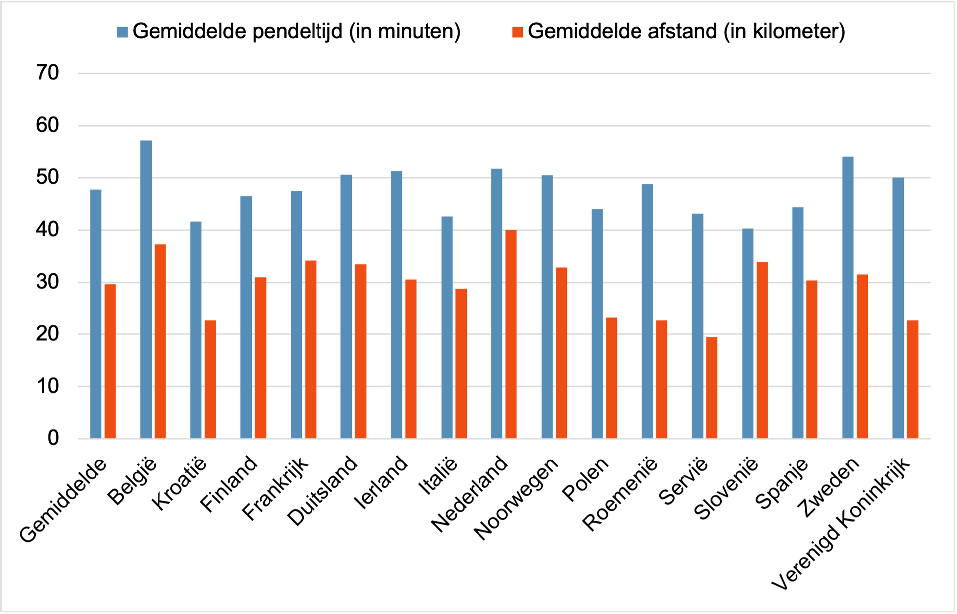 De laagste gemiddelde afstand qua woon-werkverkeer zien we in Servië (19 km), Polen, Roemenië, de UK en Kroatië (met 23 km per dag), waar ze gemiddeld tien kilometer van het werk wonen.