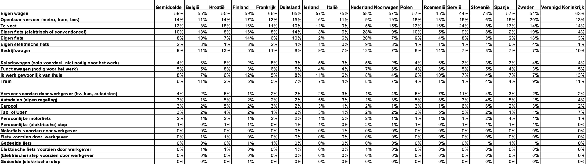 België volgt grotendeels de Europese trends in woon-werkverkeer. Maar er zijn enkele opvallende verschillen. Net als in de rest van Europa is de eigen wagen het dominante vervoersmiddel, al ligt het gebruik in België (55%) iets onder het gemiddelde (59%). Openbaar vervoer (metro, tram, bus) en wandelen zijn in België minder gangbaar dan elders in Europa. De bedrijfswagen is in België iets populairder (11%) dan gemiddeld, en vergelijkbaar met Frankrijk, maar minder dan in Nederland. De trein scoort in België opvallend goed in dit onderzoek (11%), bijna dubbel zo hoog als het Europese gemiddelde (6%), omdat ook ambtenaren deel uitmaken van het onderzoek. De meeste ambtenaren reizen gratis met de trein. Wat fietsen betreft, blijft Nederland koploper, maar België doet het relatief goed met 10% voor de gewone fiets en 8% voor de elektrische, beide boven het Europese gemiddelde. Bijna een op de vijf Belgen (18%) komt met een gewone of elektrische fiets naar het werk en daarmee zitten we in de Europese top drie van fietslanden. Er is ook een groep zonder regelmatig woon-werkverkeer (door thuiswerk), maar deze is in België kleiner (7%) dan in de meeste andere landen, maar landen als Noorwegen, Italië, Frankrijk, Slovenië en Kroatië geven nog minder thuiswerk aan.