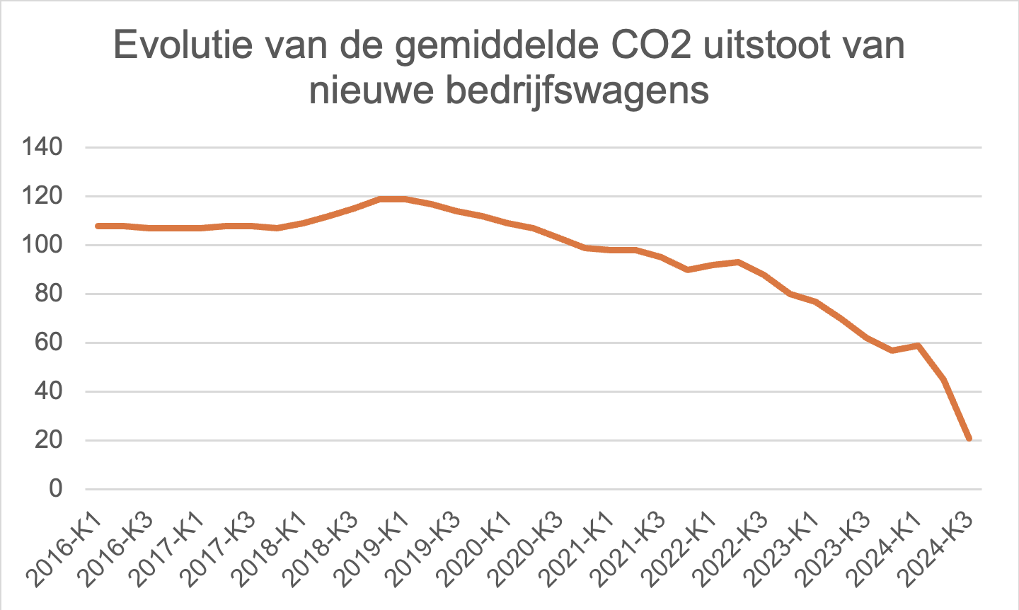 De gemiddelde CO2-uitstoot daalt tot 14 g/km in het laatste kwartaal van 2024. Eind 2024 zijn acht op de tien nieuwe bedrijfswagens 100 procent elektrische wagens. Deze hebben 0 gram CO2-uitstoot wat meer doorweegt dan de uitstoot van de gemiddelde diesel- en benzinewagens (resp. 114 en 66 in vierde kwartaal). Sinds begin 2024 zijn trouwens ook de benzinewagens en hun plug-in hybride varianten, in vrije val. Ook de diesels dalen verder tot 2,5% van de nieuwe bedrijfswagens.