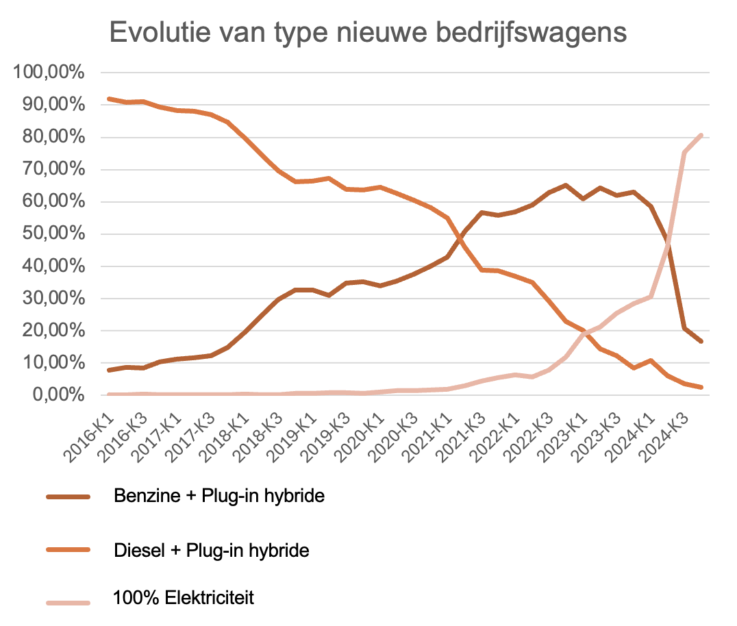 Op basis van een analyse bij 1,2 miljoen werknemers in de privésector met ongeveer 175.000 bedrijfswagens stelt SD Worx vast dat het aantal bedrijfswagens voor het tweede jaar op rij lichtjes daalt. Daarnaast zet de vergroening zich door. De gemiddelde CO2-uitstoot van nieuwe bedrijfswagens daalt in het vierde kwartaal van 2024 tot 14 g/km. Dit komt doordat 80% van de nieuwe bedrijfswagens volledig elektrische wagens zijn. Benzine- en dieselwagens (en hun hybride varianten) vallen terug op resp. 17% en 2,5%. De bedrijfswagen werd door de band genomen in 2024 8,7% duurder (mediaanwaarde van € 43.800). Daarnaast bevraagt SD Worx elk jaar ongeveer 5.118 werkgevers in 18 Europese landen. Daaruit blijkt ook dat België samen met Engeland en Ierland in de top drie staat qua werknemersklachten over de vergroening.