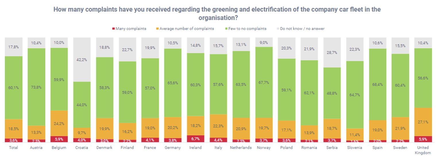 Belgische werkgevers kregen meest klachten over de vergroening van het wagenpark (samen met de UK en Ierland): maar liefst een op drie Belgische werkgevers (30%) krijgt vragen of klachten. Daarvan kreeg zelfs zes procent veel klachten. “Waarover de klachten precies gaan, halen we niet uit deze studie, maar uit contacten met klanten-werkgevers constateert SD Worx dat dit heel breed gaat. Werkgevers kunnen hiermee aan de slag gaan om hun policy te verfijnen”, besluit Veerle Michiels van SD Worx. Klachten gaan onder meer over: |