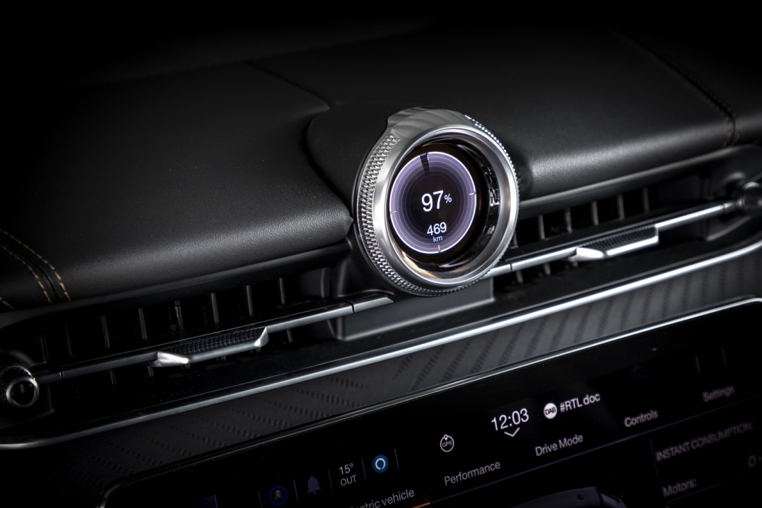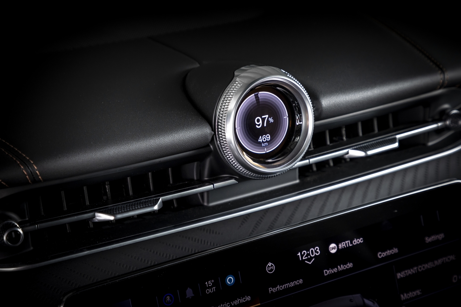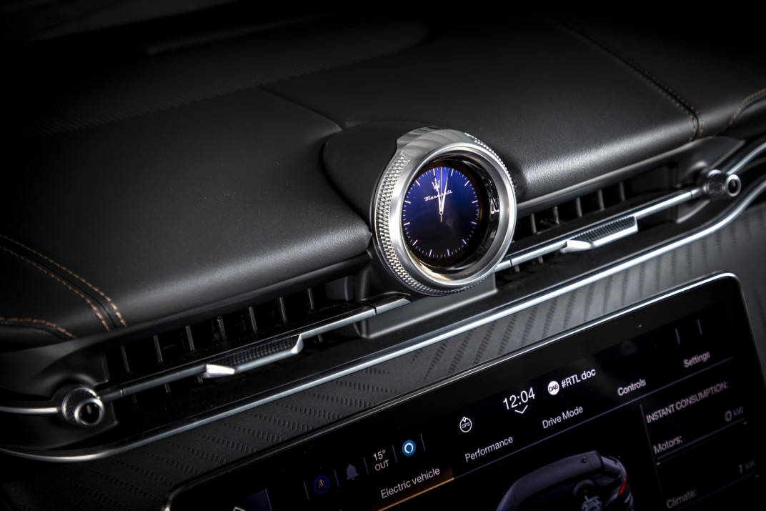 Centraal bovenaan in het dashboard vinden we zoals steeds bij Maserati een analoog klokje, of liever een rond digitaal schermpje waarop een analoog klokje wordt weergegeven. Het komt naar onze smaak iets minder geraffineerd over dan het origineel, maar heeft dan wel als voordeel dat er ook de laadstatus en het rijbereik op kunnen worden getoond.