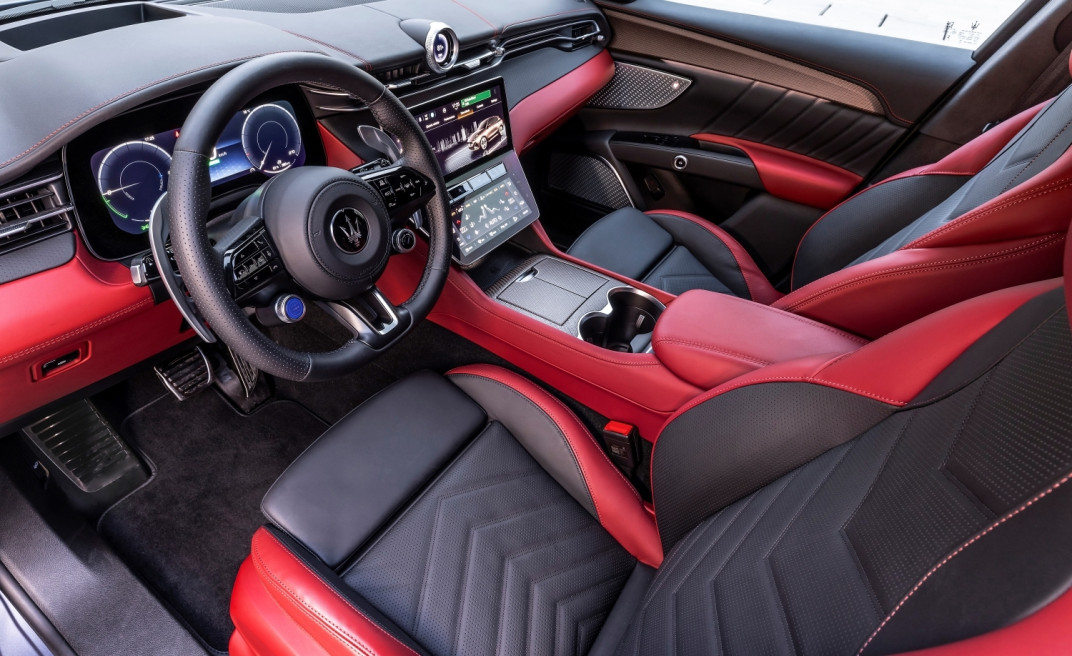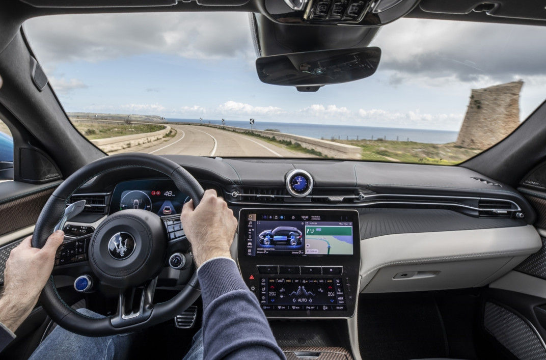 Ook binnenin is de Folgore niet te onderscheiden van de brandstof-Grecale’s, op de specifieke menu’s op de verschillende schermen en ook hier wat koperen accenten na. Dat wil zeggen dat de spatels achter het stuur – die in dit geval niet dienen om te schakelen, maar om de remenergierecuperatie te regelen – in de praktijk ook hier een beetje te groot zijn en soms in de weg zitten wanneer je een van de stuurhendels wilt bedienen.