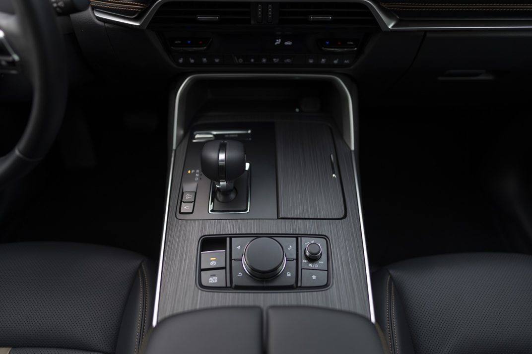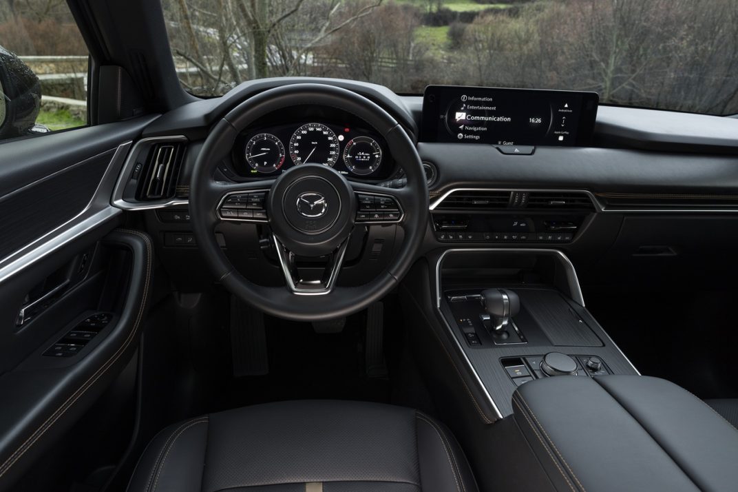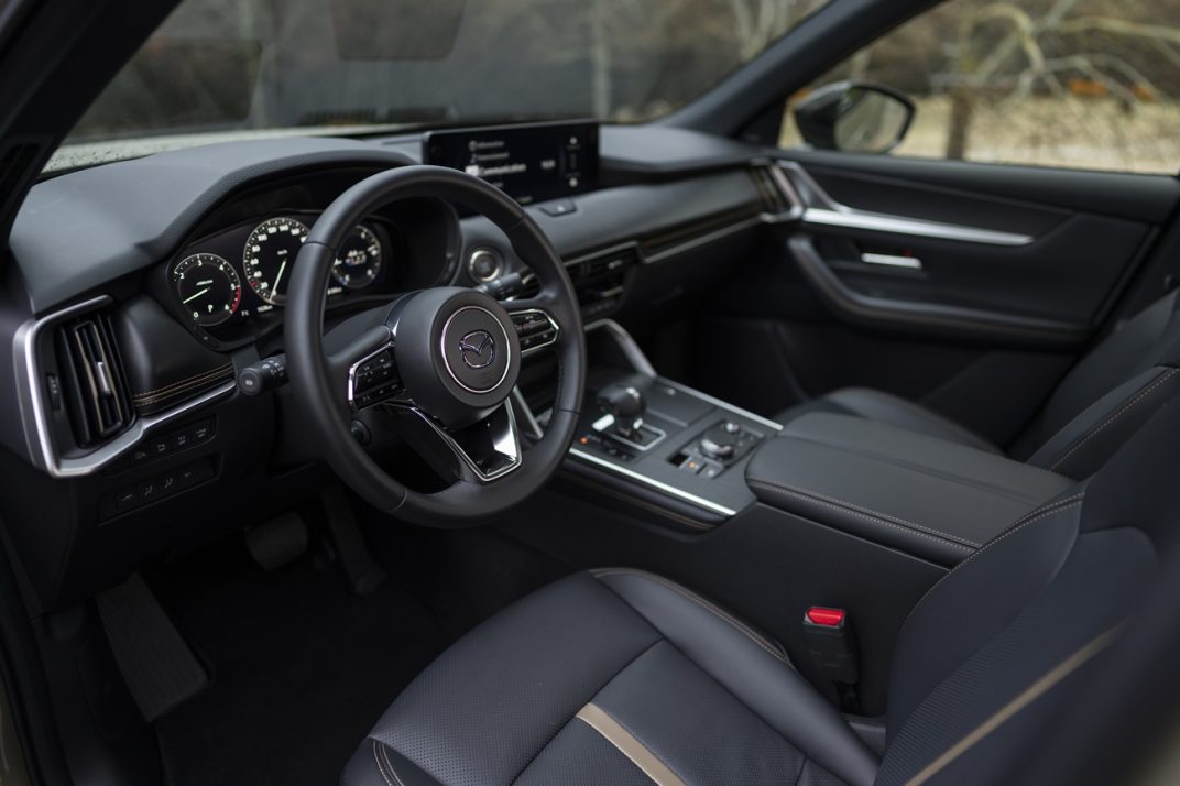Qua aandrijflijnen valt er niets nieuws te melden. De benzinemotor van 2,5-liter wordt nog steeds gecombineerd met een elektromotor voor een totaal vermogen van 327 pk. Met de batterij van 17,8 kWh kan de CX-60 in het beste geval zo’n 60 km afleggen in elektrische modus. In vergelijking met de huidige concurrentie is dat aan de lage kant. Zodra de accu leeg is klimt het brandstofverbruik gezien het gewicht van twee ton gemakkelijk boven de 8 liter/100 km. Bovendien past de motor-versnellingsbakcombinatie van de dieselversie veel beter bij deze CX-60: de 3,3 liter grote zescilinder-diesel (200 pk met achterwielaandrijving of 254 pk met vierwielaandrijving) is zacht en vloeiend en klinkt aangenamer. Maar fiscaal gezien is deze nobele motor, die in staat is om in reële omstandigheden minder dan 5 liter/100 km te verbruiken, natuurlijk niet aan te raden.
