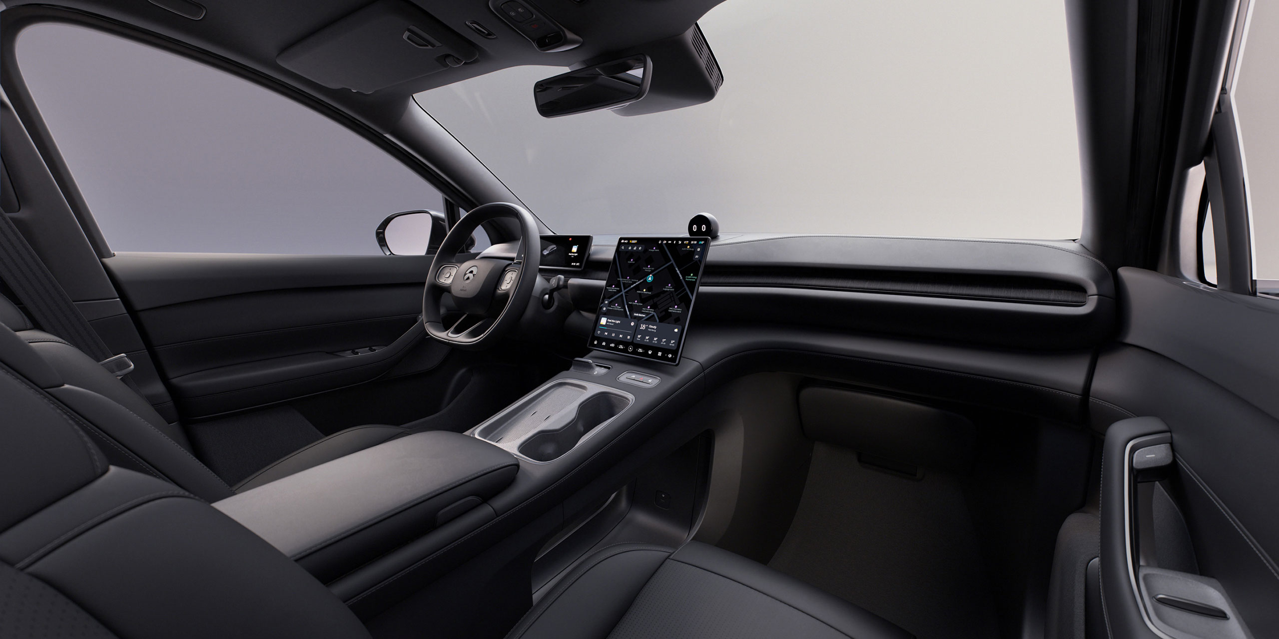 Nio kiest resoluut voor een minimalistisch interieur met op de middensole slechts drie fysieke knoppen: één voor de waarschuwingsknipperlichten, één voor deurontgrendeling en één die rechtstreeks toegang geeft tot de auto-instellingen. Via die laatste stel je onder meer de rijmodi in (aangepast, comfort, eco, sport en sport+), net als de ophanging (zacht, standaard of hard), regeneratief remmen (laag, standaard of hoog) en extra modi zoals sneeuw, nat, zand, “heuvelafrijregeling” en een eenpedaalmodus.