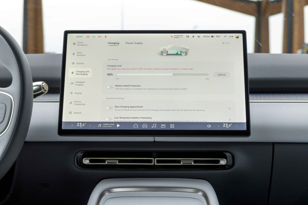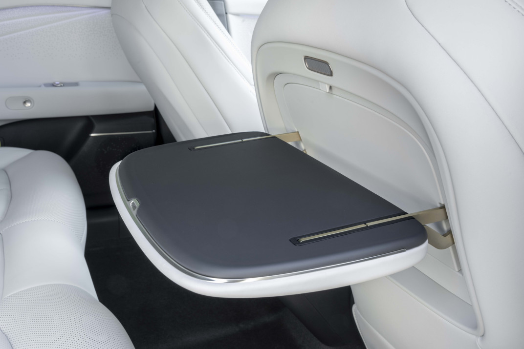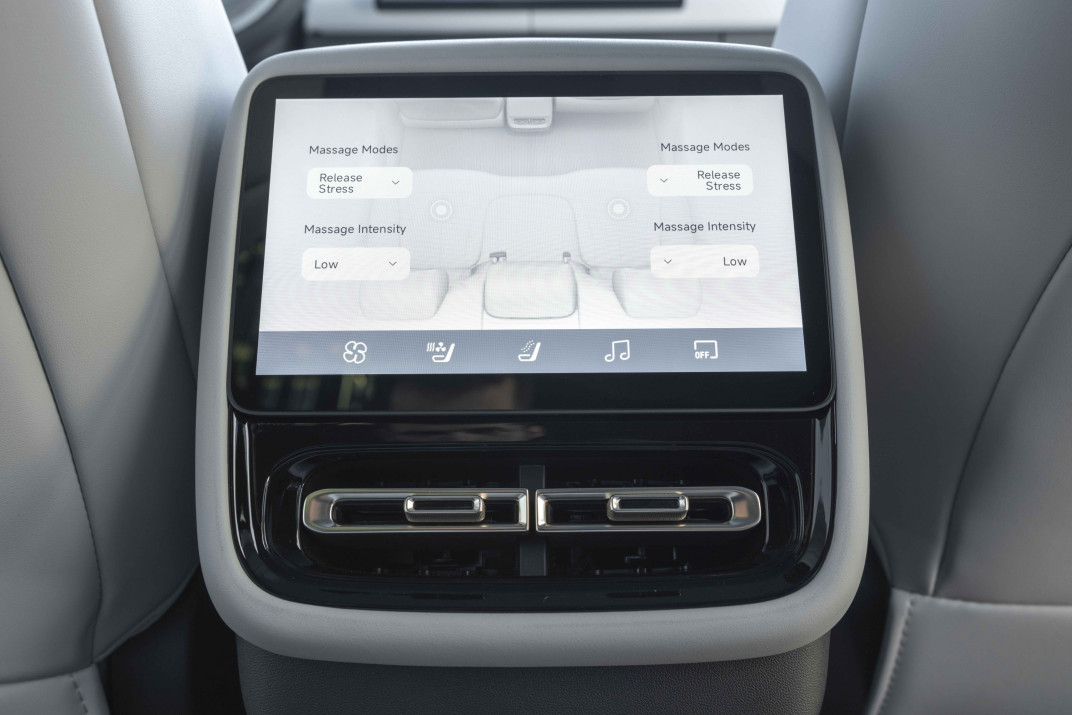 Het dashboard is voorzien van een dubbele draadloze lader voor smartphones – erg handig! –, de stoelen bieden verschillende massagefuncties, terwijl alle voor- en achterstoelen verwarmd en geventileerd zijn. Achterin beschikken de passagiers bovendien over een klein scherm om deze functies te bedienen, maar ook bijvoorbeeld de muziek. Een uitrusting die je doorgaans aantreft in voertuigen uit hogere segmenten – en vooral in duurdere modellen.