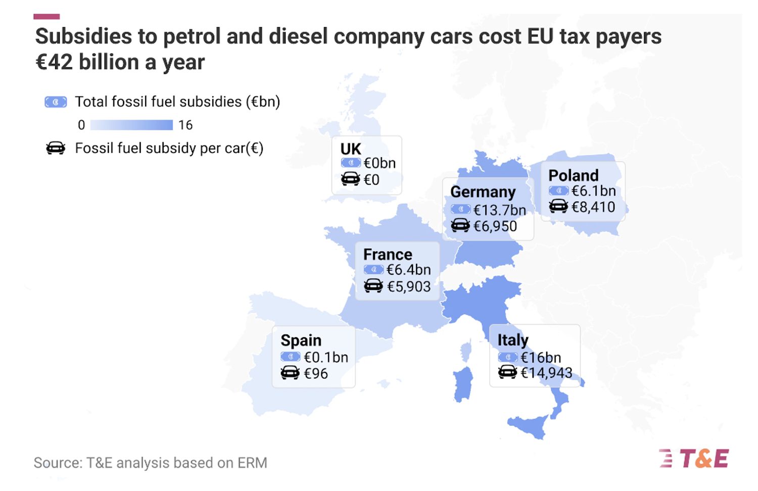 Subsidies voor fossiele brandstoffen kosten de Europese belastingbetalers elk jaar miljarden euro’s. Vooral bedrijfswagens profiteren, wat de transitie naar een groenere toekomst bemoeilijkt, zo blijkt uit een nieuw onderzoek van Transport & Environment (T&E).