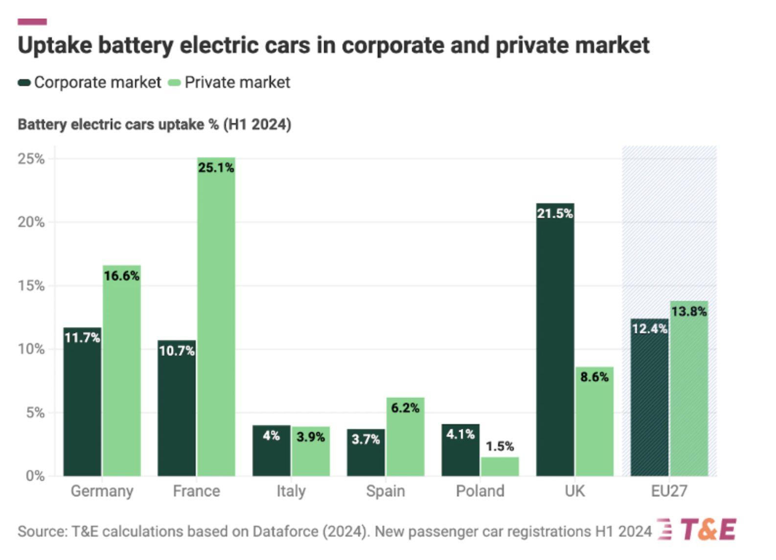 Landen zoals Frankrijk laten echter een opvallend verschil zien tussen de particuliere en de zakelijke markt. In Frankrijk is maar liefst 25,1 procent van de particuliere markt elektrisch, tegenover 10,7 procent bij bedrijfswagens. Dit benadrukt dat er op de zakelijke markt nog veel ruimte is voor vergroening.