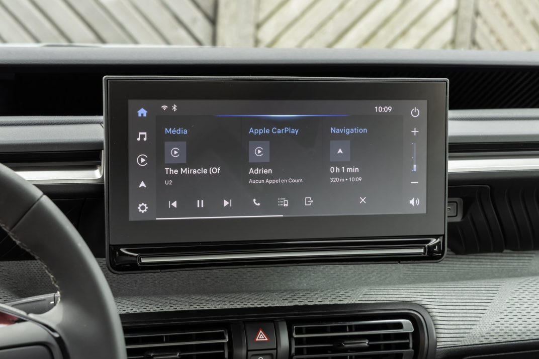 Citroën a choisi de conserver quelques commandes physiques en bas du tableau de bord pour la gestion de l’air-conditionnée. Pour le reste, tout se passe via l’écran central tactile de 12,25 pouces qui trône au centre de la console, en tout cas sur la finition haut de gamme Max. Sur la version d’entrée de gamme, Citroën propose une connexion NFC qui permettra au conducteur de connecter son smartphone à la voiture grâce à l’application Citroën pour pouvoir gérer la radio, la navigation et d’autres commandes de base.
