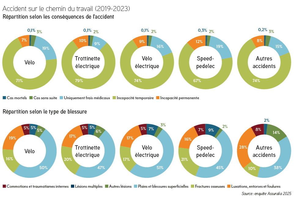 L’étude d’Assuralia montre en effet que près de 8 accidents du travail sur 10 impliquant un scooter électrique entraînent une incapacité de travail temporaire, et 12 % de ceux impliquant un speed pedelec entraînent même une incapacité permanente. Il est donc clair que les coûts peuvent être élevés. Comme nous l’avons déjà mentionné, les dommages corporels et l’incapacité de travail dans de tels cas sont de toute façon couverts par l’assurance accidents du travail, qui est obligatoire dans notre pays.