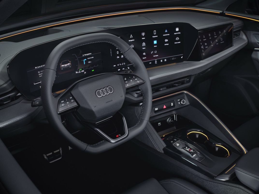 Sans surprise, le tableau de bord présente de fortes similitudes avec celui de la nouvelle A5. Ici aussi, le Virtual Cockpit de 11,9 pouces et l’écran tactile central MMI de 14,5 pouces peuvent être complétés en option par un écran passager de 10,9 pouces qui devient invisible pour le conducteur pendant la conduite. En outre, Audi est particulièrement fier de l’éclairage d’interaction dynamique IAL (en option), qui s’étend sur toute la largeur de l’habitacle sous la forme d’une bande lumineuse à LED et favorise l’interaction des occupants avec la voiture.
