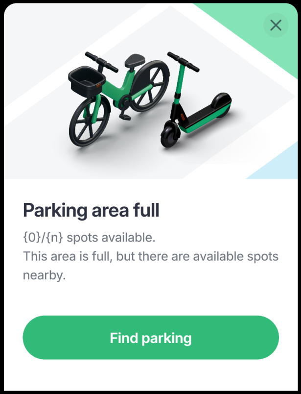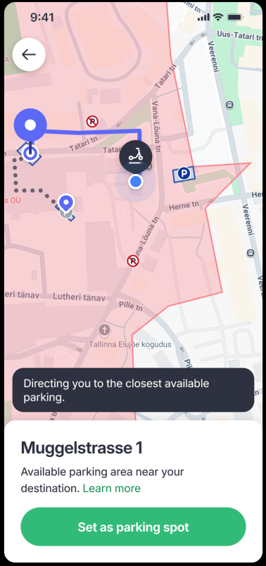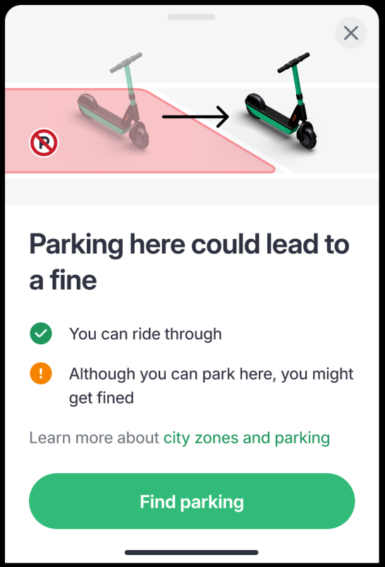 Lorsqu’un utilisateur approche de la fin d’un trajet, l’application Bolt indique les places de stationnement agréées à proximité. L’utilisateur suit la navigation intégrée à l’application, qui lui fournit des informations en temps réel sur la disponibilité, l’adresse exacte et l’emplacement visuel du parking. Cela aide les utilisateurs à trouver une place valide en fonction des conditions actuelles. Afin d’éviter les erreurs de stationnement, les parkings complets sont automatiquement affichés en gris et les utilisateurs reçoivent une notification lorsqu’une zone n’est pas disponible, ce qui empêche de terminer des trajets dans des zones non valides.
