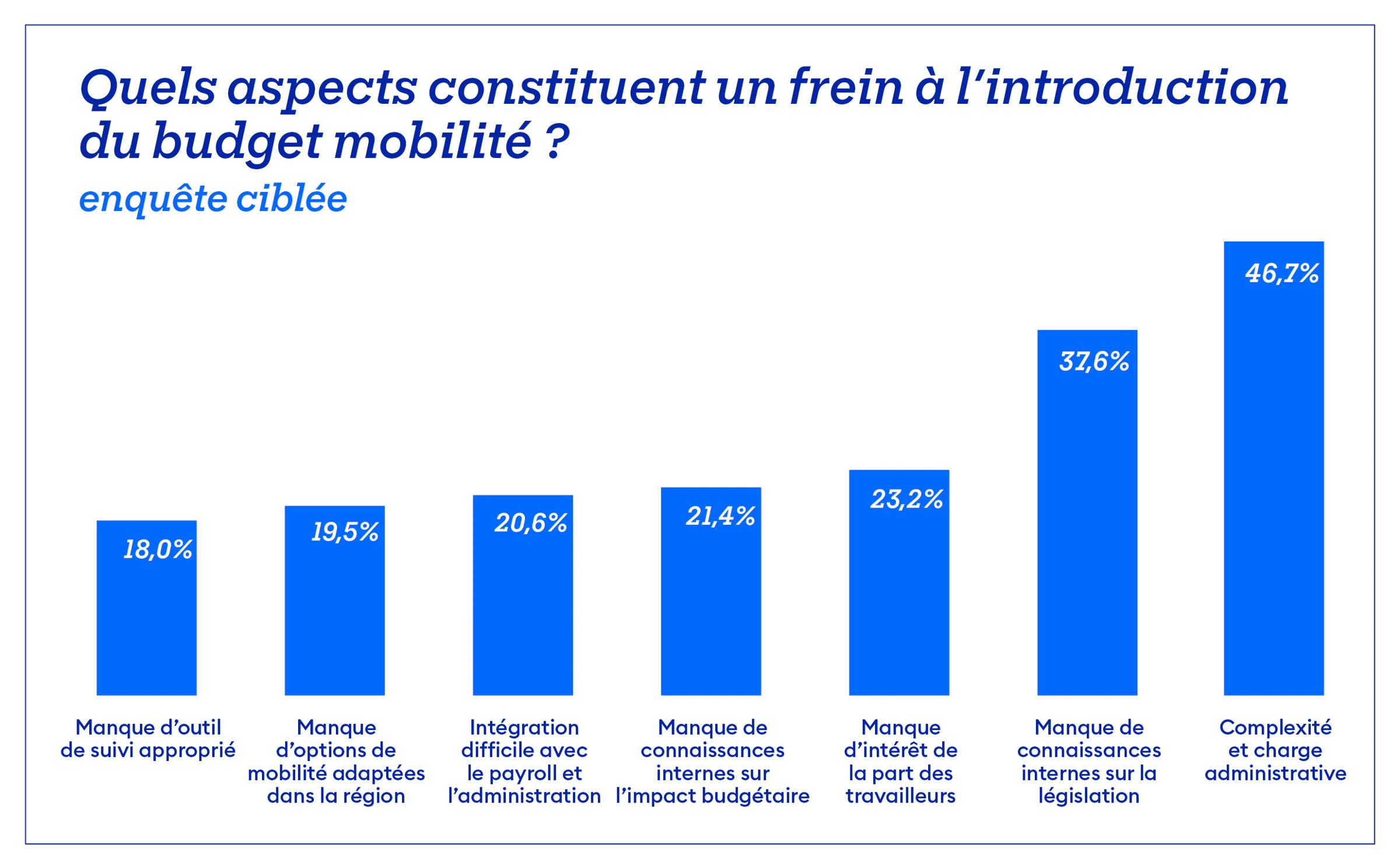 Pas moins de 92,8 % des employeurs comptant au moins 10 travailleurs n’offrent pas (encore) de budget mobilité. La raison principale ? La complexité administrative. Plus de la moitié des employeurs considèrent l’établissement et la gestion du budget comme un frein. Il faut savoir que la moitié d’entre eux sollicitent un fournisseur de mobilité externe pour ce faire, tandis que l’autre moitié essaie de l’organiser en interne.
