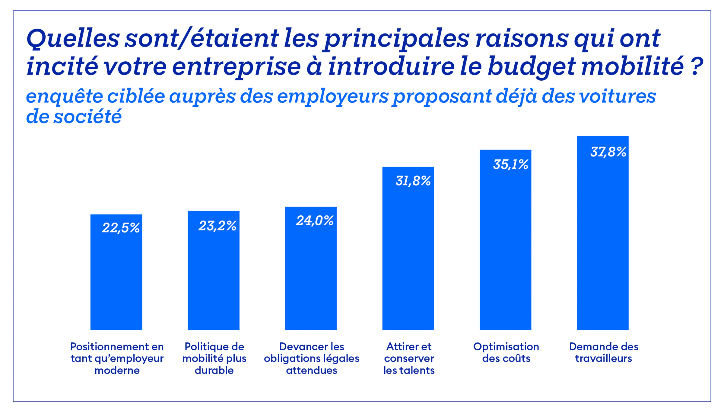 Près de 4 sur 10 (37,8 %) déclarent introduire le budget mobilité à la demande de leurs travailleurs ; en outre, un tiers des répondants (31,8 %) le considèrent comme un outil pour attirer des talents. L’optimisation des coûts représente également une motivation essentielle pour 35,1 % des employeurs.