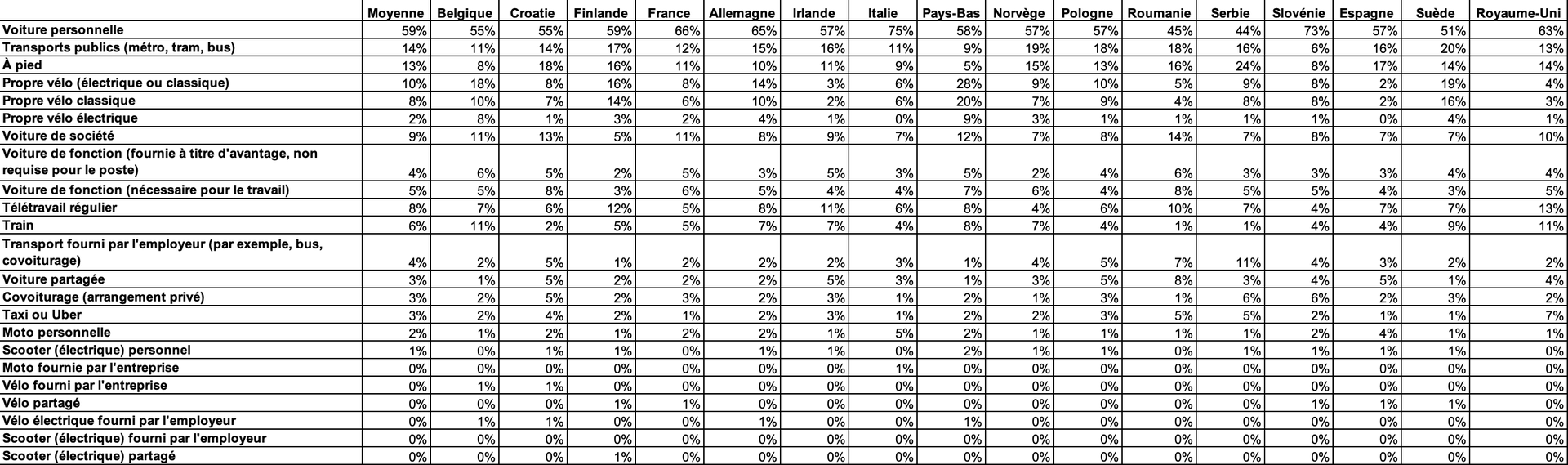 « La voiture personnelle reste le principal moyen de transport pour se rendre au travail en Europe. L’enjeu, désormais, est de verdir ce parc automobile, même si dans certains pays le vélo domine déjà. Ceux qui viennent à vélo ou à pied sont aussi les plus satisfaits. Ils sont moins dépendants des facteurs externes et ont plus de contrôle sur leur temps. D’autres solutions telles que les voitures partagées ou le covoiturage restent marginales. Le télétravail partiel fait bien sûr aussi partie de la solution, surtout pour les personnes qui passent plus d’une heure et demie sur la route chaque jour », conclut Valérie t’Serstevens.