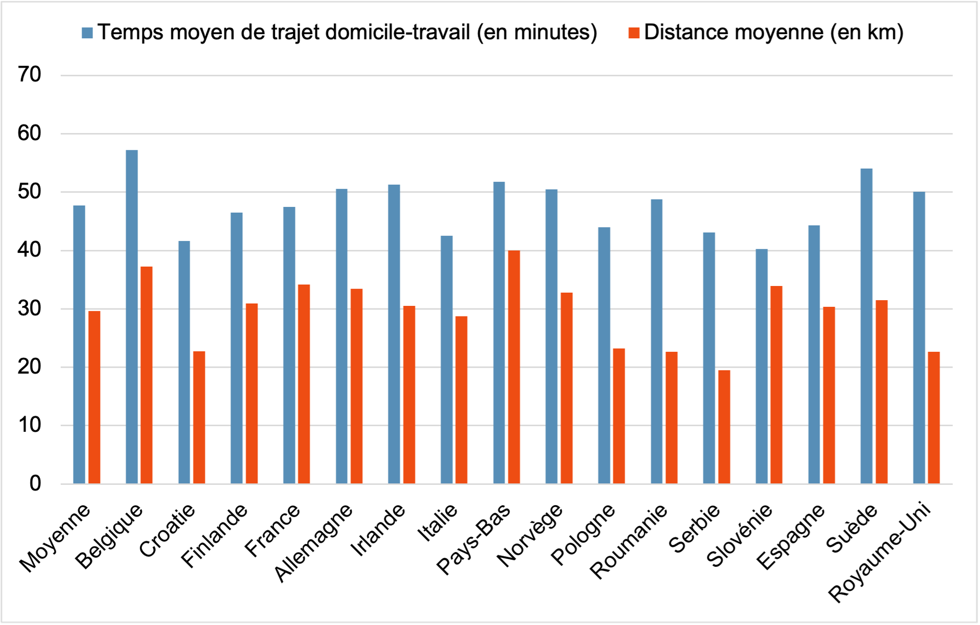Les distances moyennes les plus courtes sont observée en Serbie (19 km par jour), en Pologne, en Roumanie, au Royaume-Uni et en Croatie (avec 23 km), où les travailleurs vivent en moyenne à 10 km de leur lieu de travail.