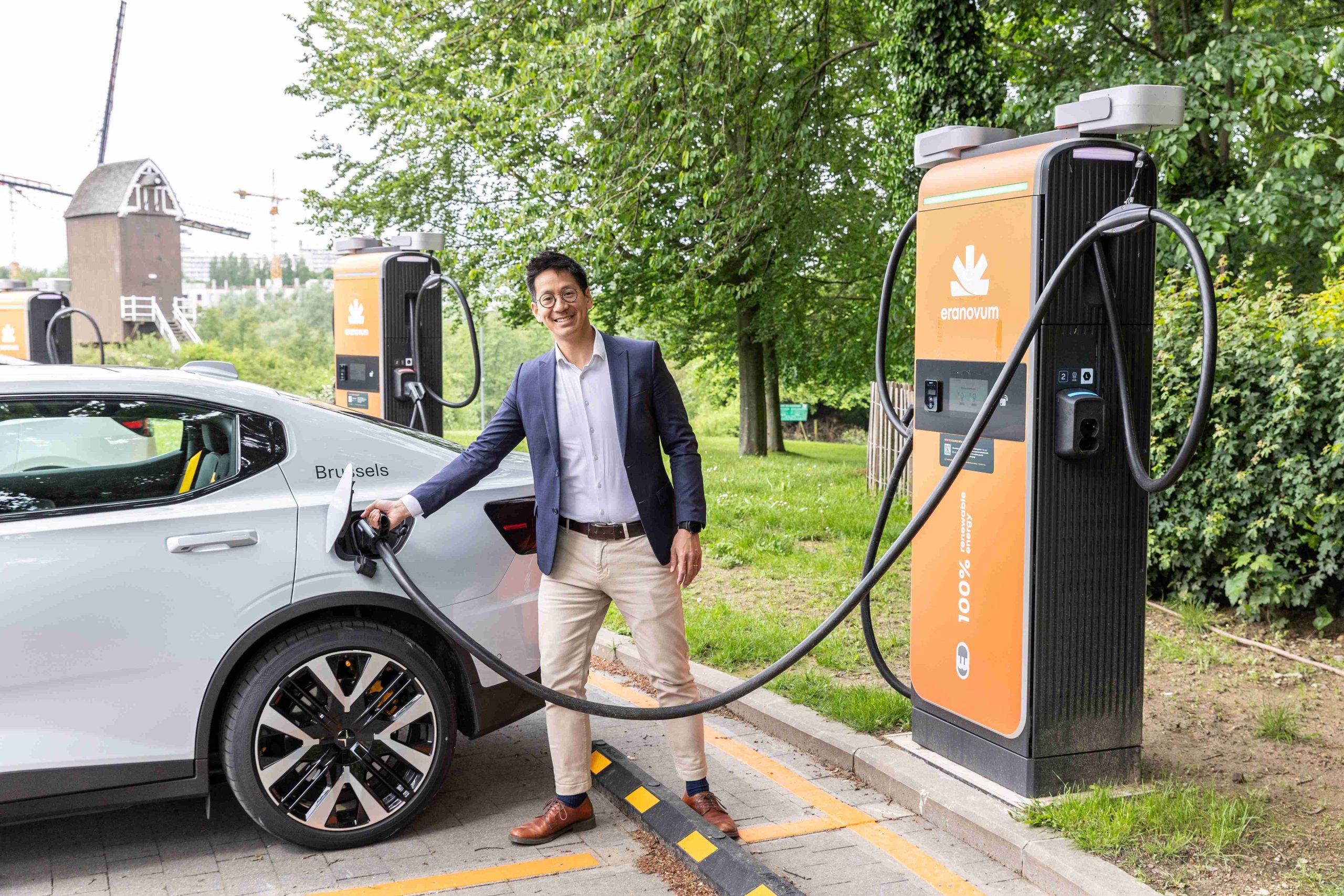 Le 14 mai dernier, Eranovum a installé ses 8 premières bornes de recharge rapide (150 kW) à l’hôtel Tangla de Woluwe-Saint-Lambert. Celles-ci sont directement reliées aux panneaux solaires placés sur le toit de l’hôtel, ce qui garantit une fourniture d’électricité verte. D’ailleurs, l’énergie renouvelable est le cheval de bataille de l’entreprise espagnole. En Belgique, elle a créé un partenariat avec Ether Energy. Et le développement des bornes ne fait que commencer, comme nous l’explique Tai Nguyen, country manager d’Eranovum Belgique.