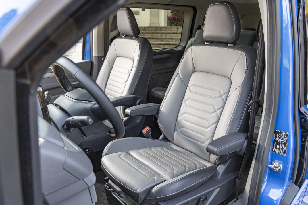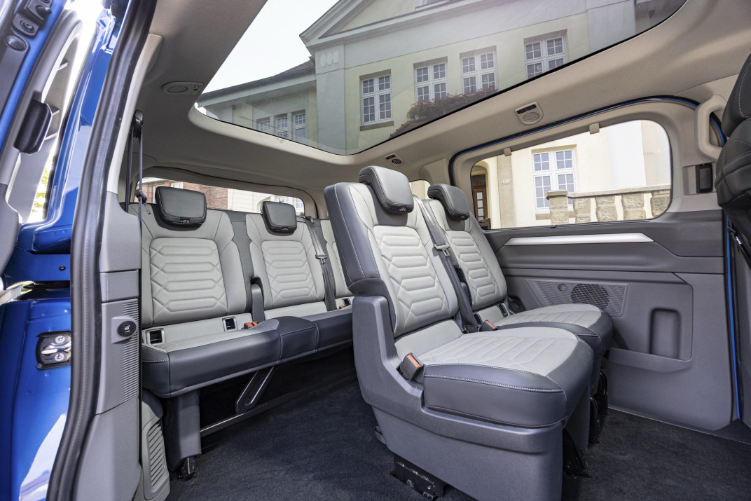 À l’avant, la Caravelle propose, au choix, deux ou trois places tandis qu’on retrouve toujours six places à l’arrière. La modularité se montre toutefois plus basique que sur un Multivan : les rails de coulissement sont absents et seuls les sièges de la deuxième rangée sont extractibles individuellement, tandis que la troisième rangée se compose d’une banquette lourde et peu flexible.