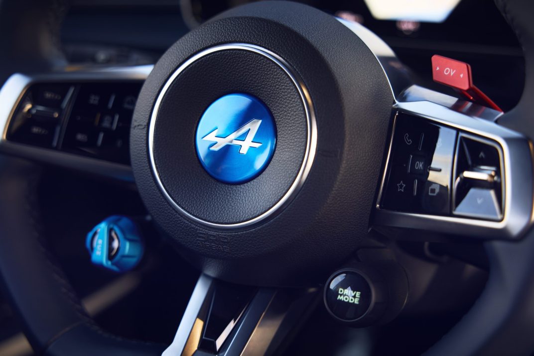 D’ailleurs, au volant, on repère rapidement un bouton rouge « OV » pour « Overtake » (dépassement, en français). Appuyer sur ce bouton permet de libérer directement toute la puissance durant 10 secondes. Un peu comme en Formule 1 ou… dans certains jeux vidéo. Un autre bouton à l’aspect très qualitatif permet de régler 4 modes de régénération d’énergie au freinage, dont un mode « roue libre ». À bord, Alpine a donc vraiment réussi à créer un univers très singulier.