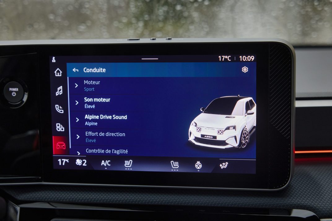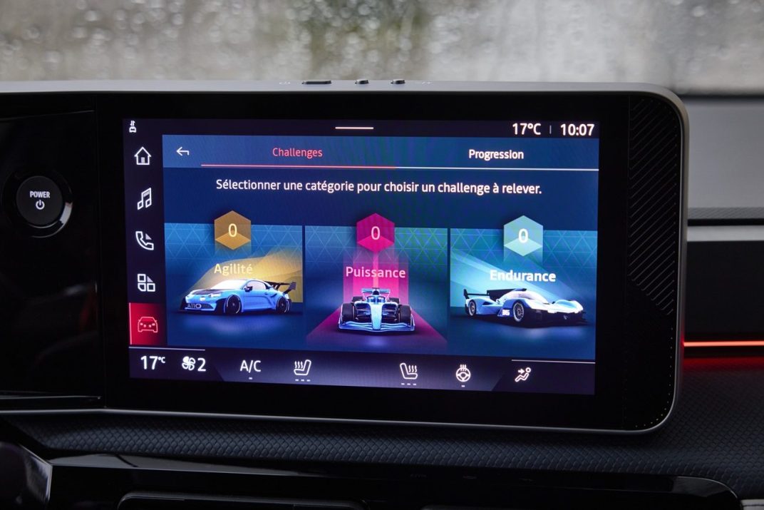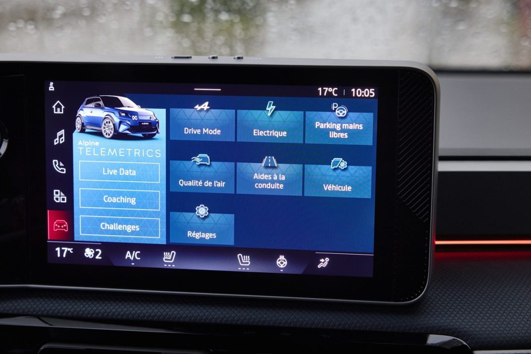 Le double-écran connu chez Renault est moderne et globalement assez intuitif. Pour se différencier de la R5, Alpine a réalisé un gros travail sur toutes les iconographies, notamment au tableau de bord. Dans le système multimédia, il y a même des modes de jeu avec des challenges de conduite, du coaching et bien d’autres gadgets encore qui s’inspirent du jeu vidéo de manière tout à fait assumée par la marque.