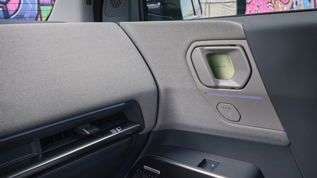 Par exemple le mot Hello qui s’illumine dans la portière quand on déverrouille la porte conducteur, un « bonne journée » inscrit derrière la poignée des portières intérieures, ou encore de petits éléments aux couleurs pastels sur le tableau et la planche de bord ainsi que la console centrale.