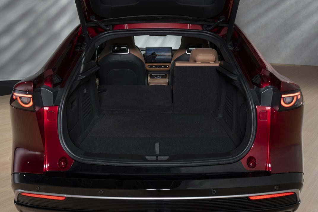 Dans l’habitacle, Mazda continue de soigner son image et, particulièrement, ses occupants. Cuir couleur fauve caramel, alcantara, inserts noirs et chrome : l’ambiance est raffinée et chaleureuse. Le toit panoramique de série inonde l’habitacle de lumière. À l’avant, la position de conduite est correcte, mais l’assise est un peu haute, alors que côté passager la hauteur est fixe. À l’arrière, où l’espace est plus généreux, c’est l’inverse : la banquette est un peu basse, plaçant les genoux en position relevée, un défaut typique des électriques, batterie sous le plancher oblige.
