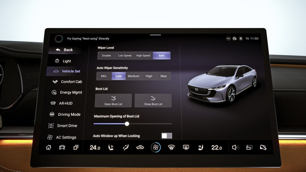 Visuellement, la 6e reste fidèle aux codes Mazda : lignes tendues, profil fluide, regard effilé. Le rouge profond “Soul Red” de notre modèle d’essai capte magnifiquement la lumière et met en valeur les galbes. L’imposante calandre, animée par des centaines de LED, affirme clairement la présence de l’auto. À l’arrière, le ton est plus sobre avec des feux affinés et un discret becquet rétractable. En résumé, une berline statutaire et élégante, qui inspire la qualité sans tomber dans la provocation.