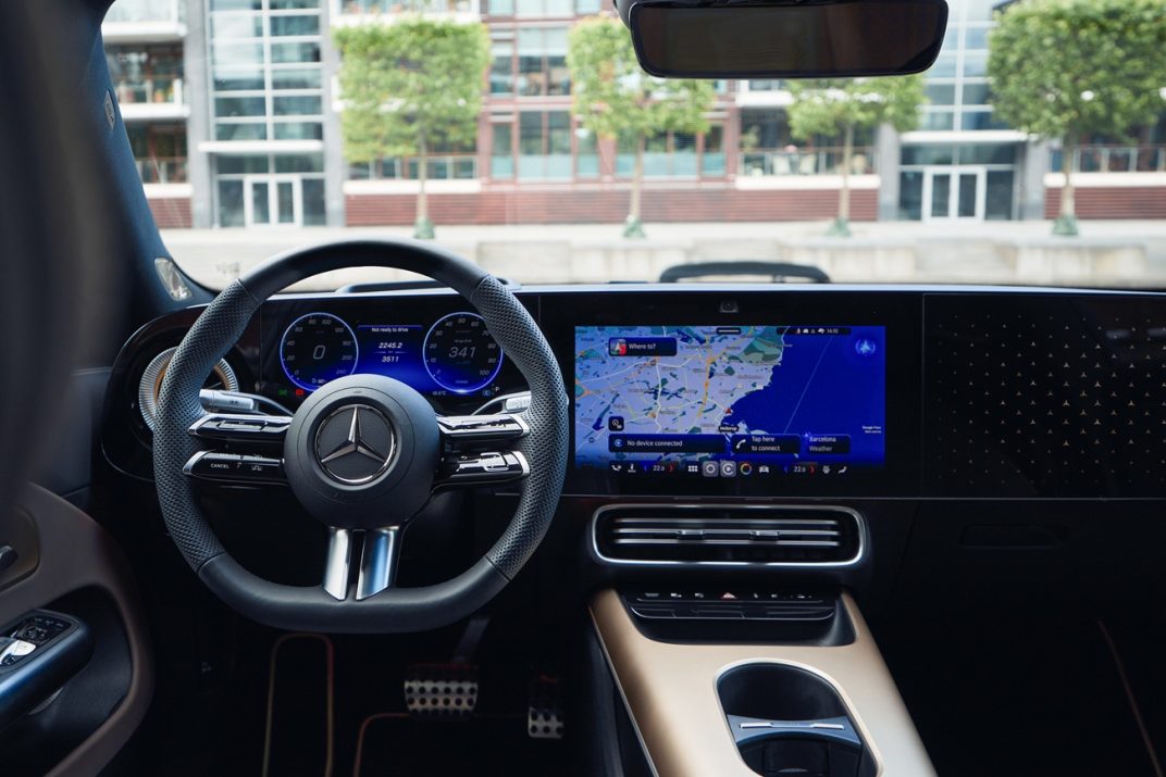 Il est temps de vous emmener avec nous sur la route pour un premier essai, sur un revêtement parfait, à Copenhague (Danemark). Première observation : une petite partie de l’écran central est cachée par le volant, ce qui témoigne encore des dimensions, à notre sens, démesurées, que les constructeurs donnent aux écrans. À notre critique, les ingénieurs Mercedes ont répondu que l’écran central ne pouvait pas être trop décalé sur la droite car, si tel était le cas, il serait trop loin pour effectuer les opérations tactiles. Il a donc fallu trouver un compromis. Oui, la majorité des opérations sont tactiles mais l’ergonomie est bonne, tout comme la vitesse du nouveau système multimédia. D’ailleurs, la navigation embarquée provient maintenant de Google Maps avec vue, en direct, sur les stations de recharge occupées ou non.