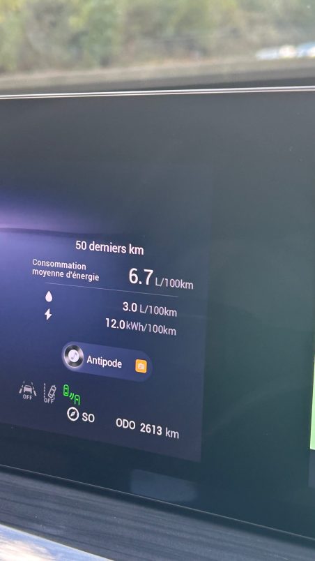 Sur un parcours mixte d’environ 50 km, l’ordinateur de bord a indiqué 3,0 l/100 km et 12,0 kWh/100 km en mode hybride. Des valeurs réalistes pour un premier roulage, à confirmer sur un essai plus long et en conduite 100 % électrique.