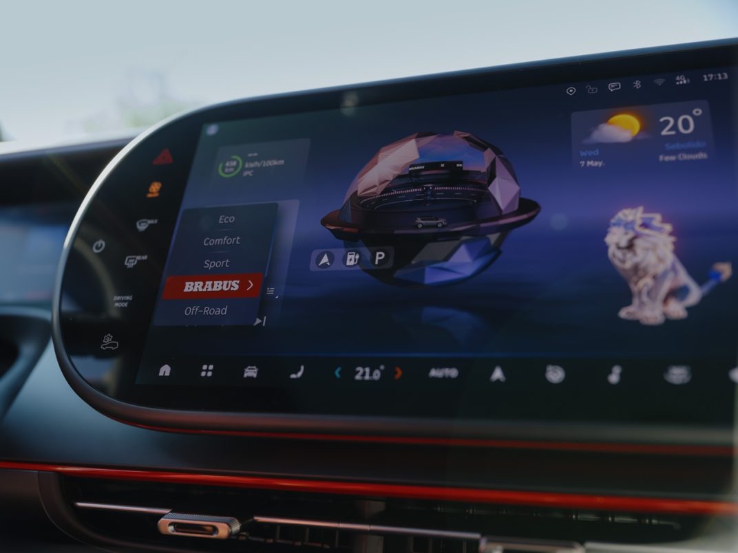 Jantes spécifiques de 21’’, étriers de freins rouges, sièges et volant en Dinamica, kit carrosserie légèrement différent aux accents rouges, sono Sennheiser avec 20 haut-parleurs, toit panoramique ouvrant : la finition Brabus se montre extrêmement attrayante. Elle embarque aussi la pompe à chaleur de série.