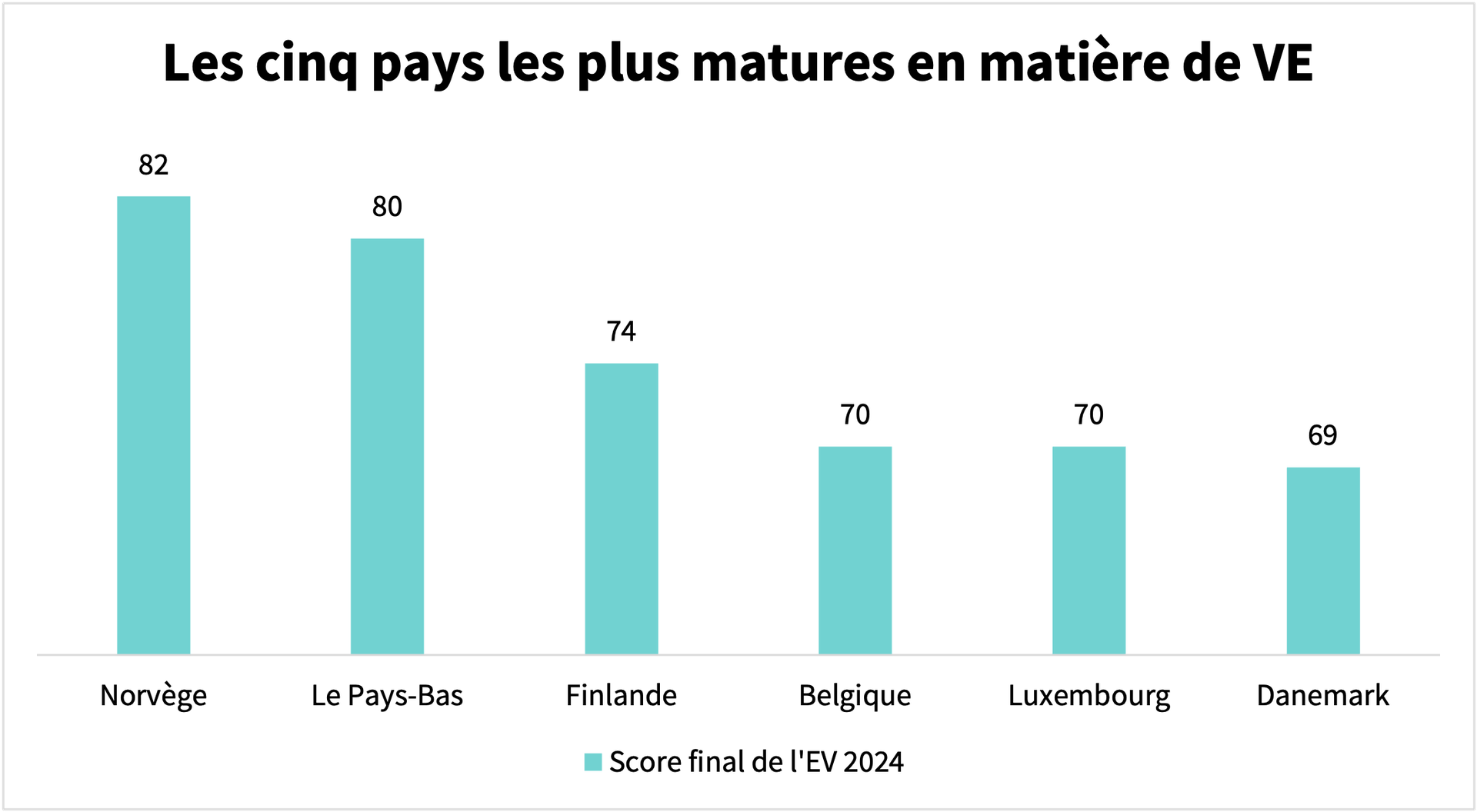 Les Pays-Bas et la Norvège sont en tête pour l’infrastructure de recharge et l’adoption des voitures électriques, avec un score de 20/25 pour l’adoption de ces véhicules. Les Pays-Bas obtiennent la meilleure note pour l’infrastructure de recharge (17/20), devant la Norvège, pionnière en cette matière (15/20).