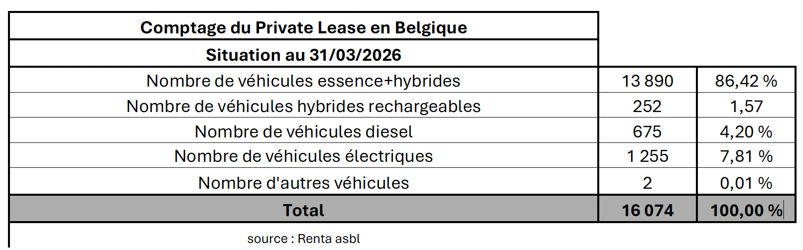 Au 31 mars 2026, exactement 16.074 voitures étaient louées en formule de leasing privé en Belgique. Cela représente 2.873 de plus qu’il y a 12 mois, lorsque le total s’élevait à 13.201. En un an, le marché du leasing privé a donc connu une croissance de pas moins de 22 % ! Alors que 86 % des voitures sont toujours équipées d’un moteur à essence (hybride ou non), la part des voitures électriques en Private Lease a doublé en un an, passant de 4 % à un peu moins de 8 % du total. La fédération belge des sociétés de leasing et de location Renta a recueilli ces chiffres pour la deuxième année consécutive auprès de ses membres, qui ne sont toutefois pas tous actifs dans ce segment de marché spécifique.
