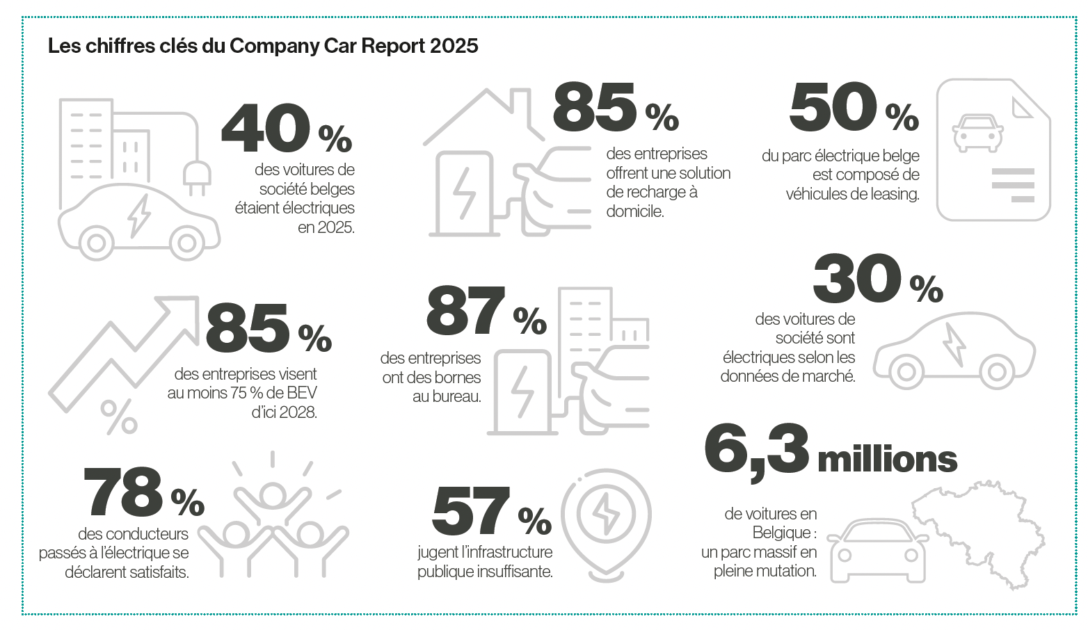 Le Company Car Report 2025, grande enquête menée par link2fleet auprès de plus de 400 gestionnaires de flotte belges, met aussi en lumière cette prépondérance de la voiture électrique au sein des parcs automobiles : 40 % des véhicules de société en Belgique sont désormais 100 % électriques. Une évolution spectaculaire, quand on se souvient qu’ils étaient moins de 10 % en 2020.
