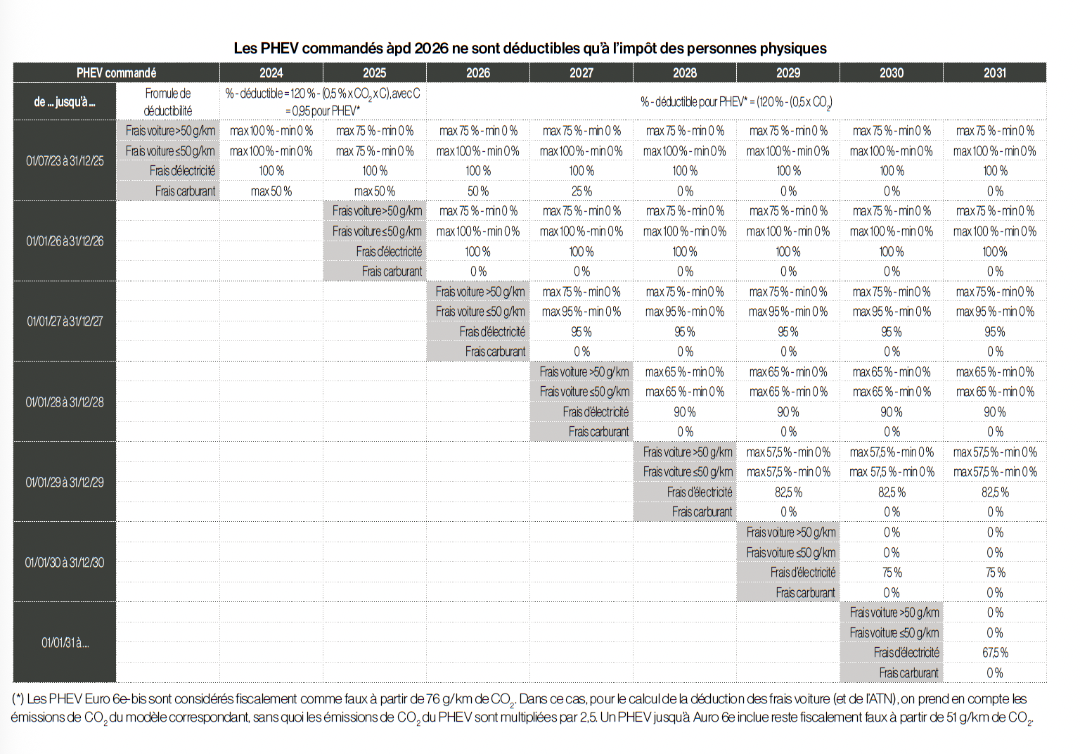 Une exception a été faite pour les PHEV achetés par des indépendants en 2026 et après. Ceux-ci restent déductibles plus longtemps dans l’impôt des personnes physiques. Voir à ce sujet le tableau FEBIAC dédié.