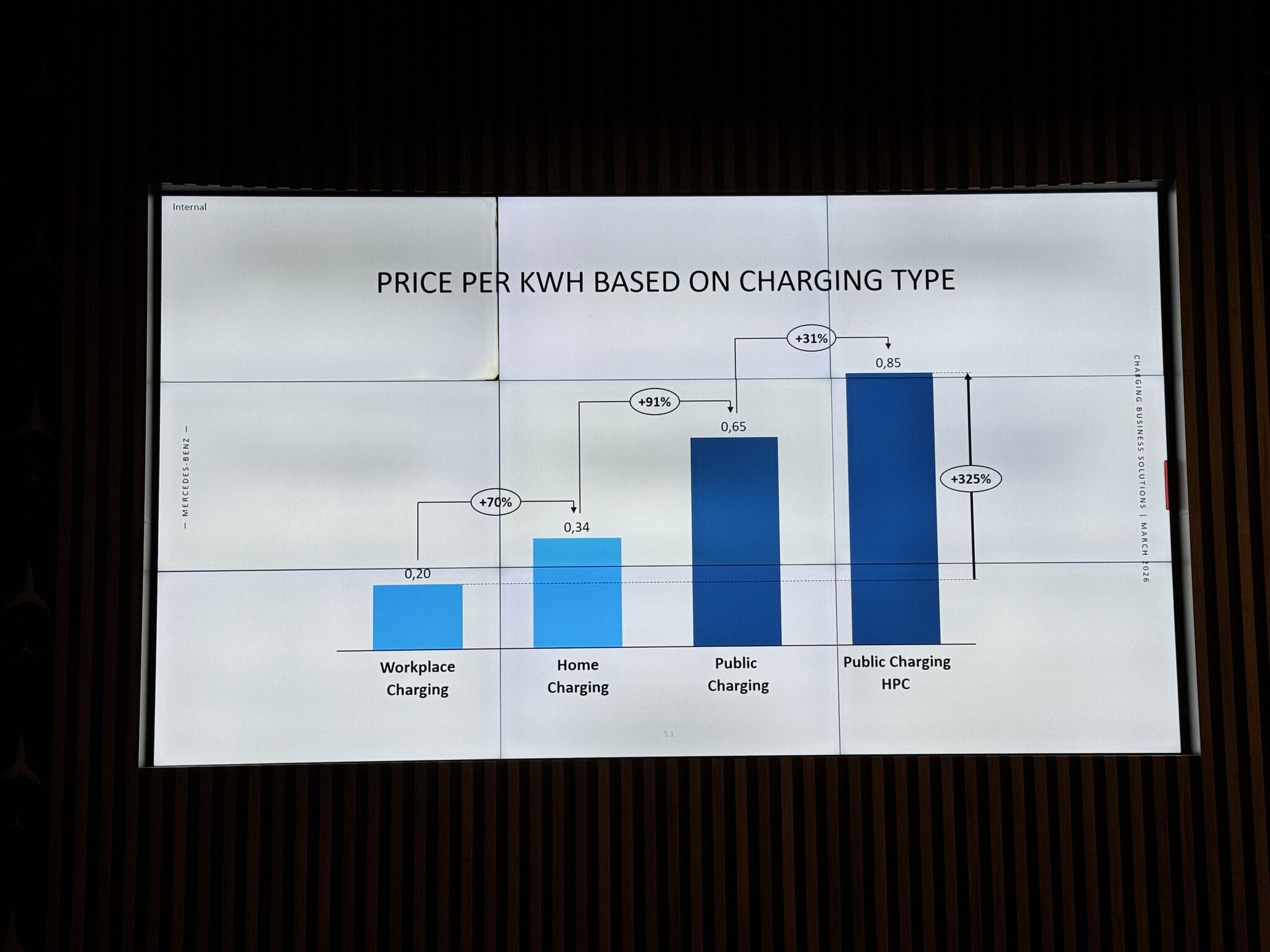 Un élément particulièrement marquant de la présentation concernait l’impact du type de recharge sur le coût de l’énergie. Comme l’illustre clairement le graphique présenté lors de la session, le prix du kWh varie fortement selon l’endroit où le véhicule est rechargé. La recharge sur le lieu de travail apparaît comme la solution la plus économique, avec un coût moyen d’environ 0,20 €/kWh, contre 0,34 €/kWh à domicile. L’écart se creuse encore davantage avec la recharge publique (0,65 €/kWh) et atteint son maximum sur les bornes rapides (HPC), où le prix peut grimper jusqu’à 0,85 €/kWh, soit plus de quatre fois le coût du workplace charging.