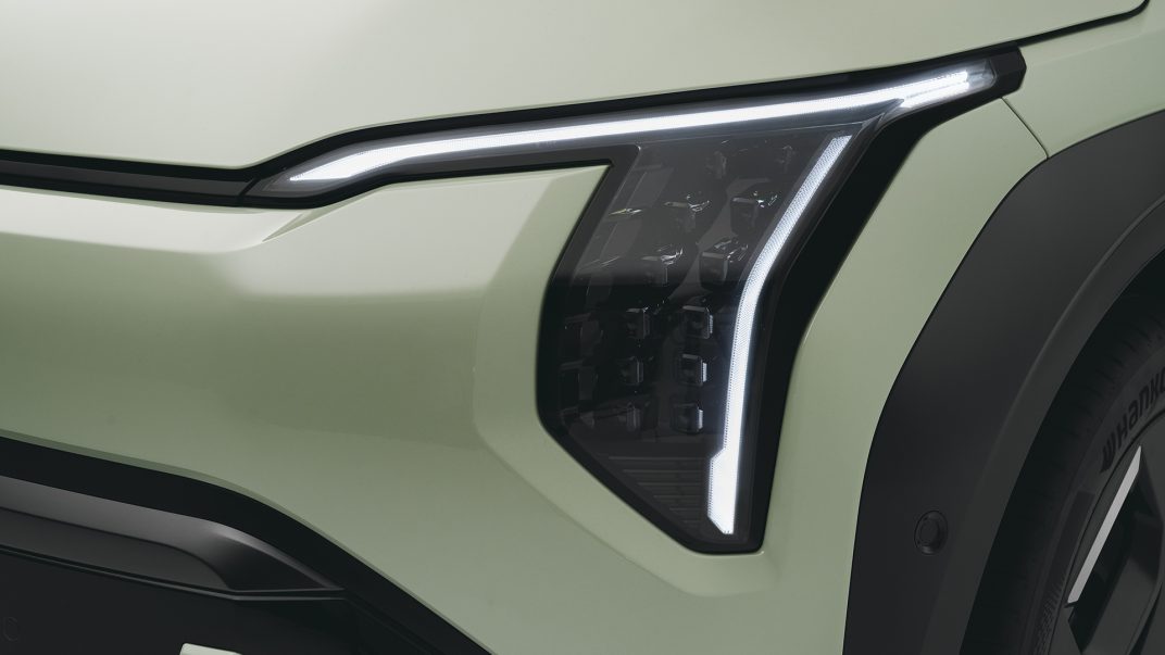 On l’a dit : l’EV3, c’est le petit frère de l’EV9. Et cela se voit quand on regarde le design et les lignes générales du véhicule. Sa face avant reprend clairement les lignes de l’EV9 et notamment les feux qui s’allongent sur la carrosserie et intègrent de petits carrés de LED.