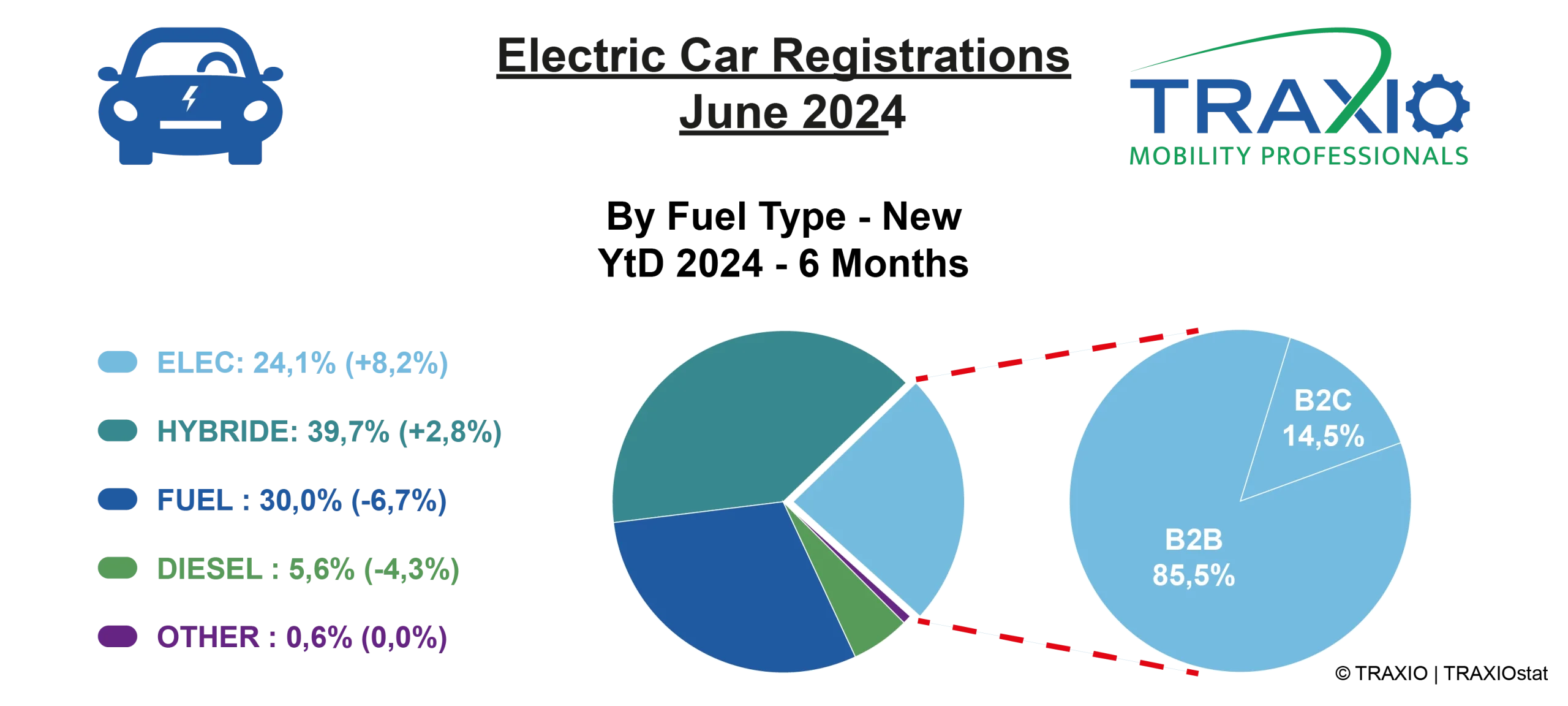 La croissance des immatriculations de voitures électriques neuves est principalement tirée par l’adoption croissante des flottes d’entreprises et du leasing, représentant 85,5% des immatriculations de VE au premier semestre 2024. En revanche, sur le marché de l’occasion, la répartition entre les immatriculations aux entreprises et aux particuliers est quasiment équilibrée : 51% contre 49%.