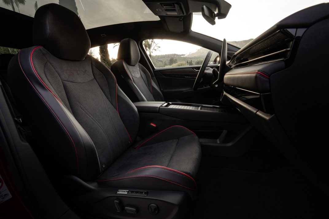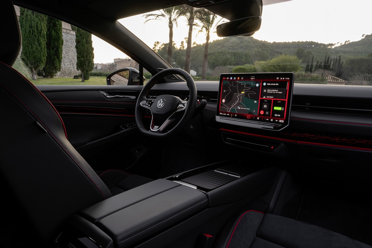 La nouvelle ID.7 GTX est reconnaissable grâce au design GTX distinctif à l’avant, à l’arrière et surtout, à l’intérieur. On y retrouve des surpiqûres rouges qui, il faut le dire, nous rappellent un peu le label GTI. Le lettrage GTX est perforé sur les dossiers des sièges. Les équipements de série seront plus nombreux, dont les nouvelles jantes « Skagen » de 20 pouces, ainsi que les feux matriciels LED IQ.Light.
